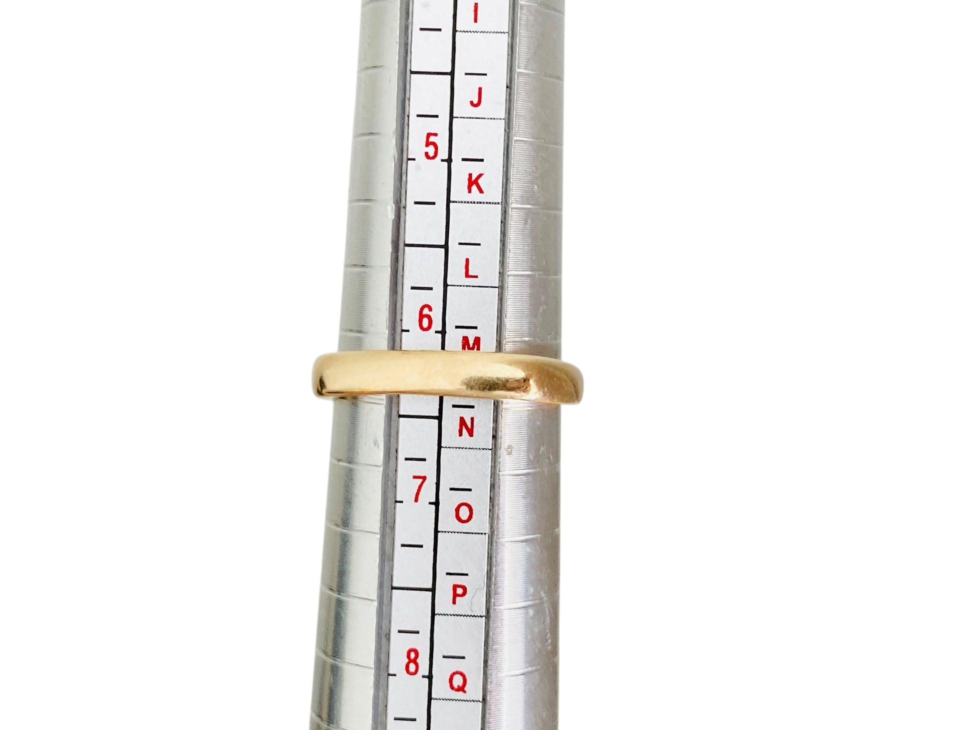 An unusual designed diamond ring. The front measures 5mm wide and features a 3mm round-cut diamond. The back of the band is flatter than a typical ring on the outside but still rounded on the inside of the band. The back of the band measures 3mm wide.