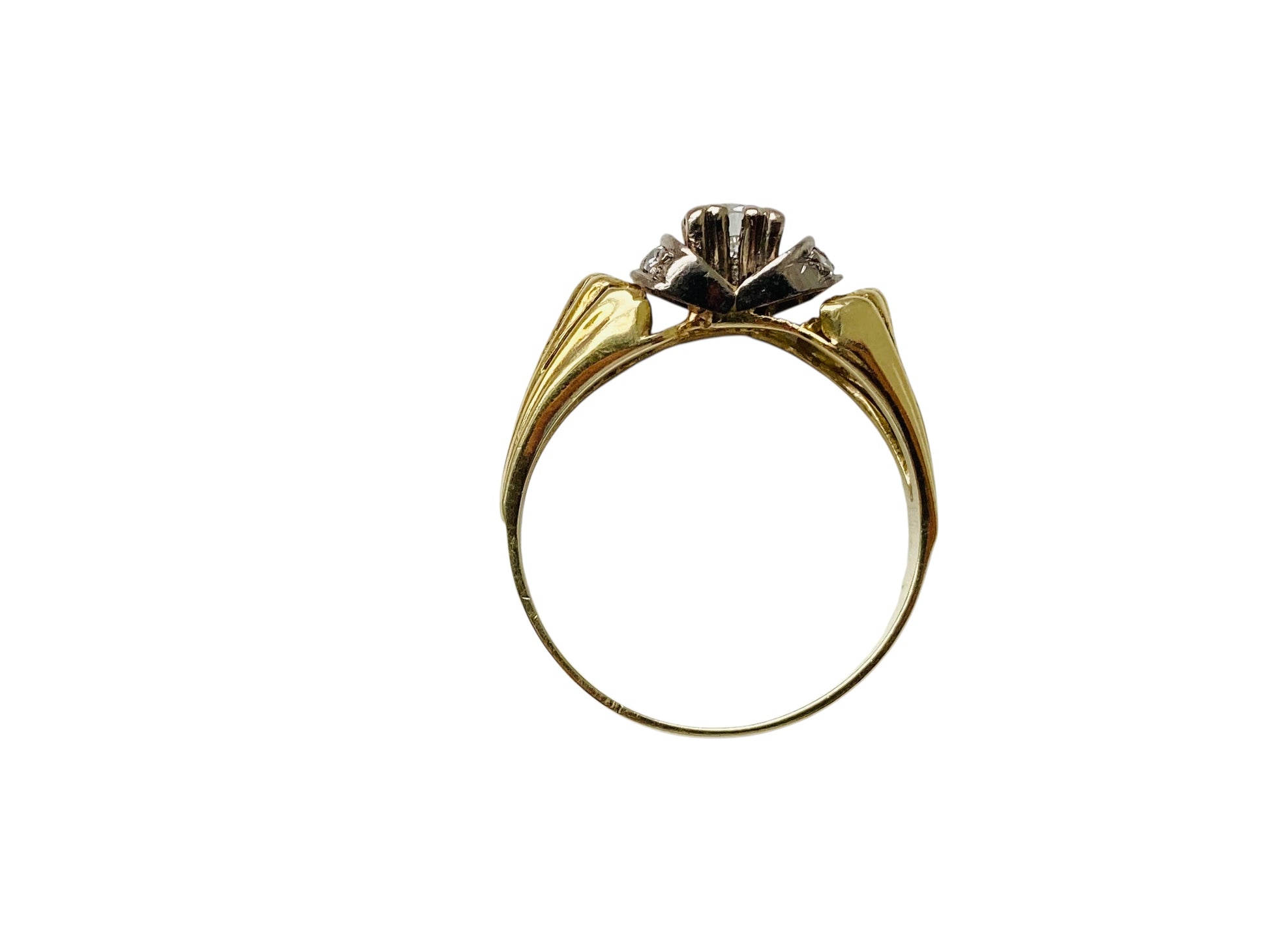 The ring features a 4.3mm round-cut natural earth mined diamond (estimated 0.30ct) with three small round diamonds to each side. The diamonds are set into 14ct white gold. The band of the ring is yellow gold with each shoulder measuring 7mm wide.