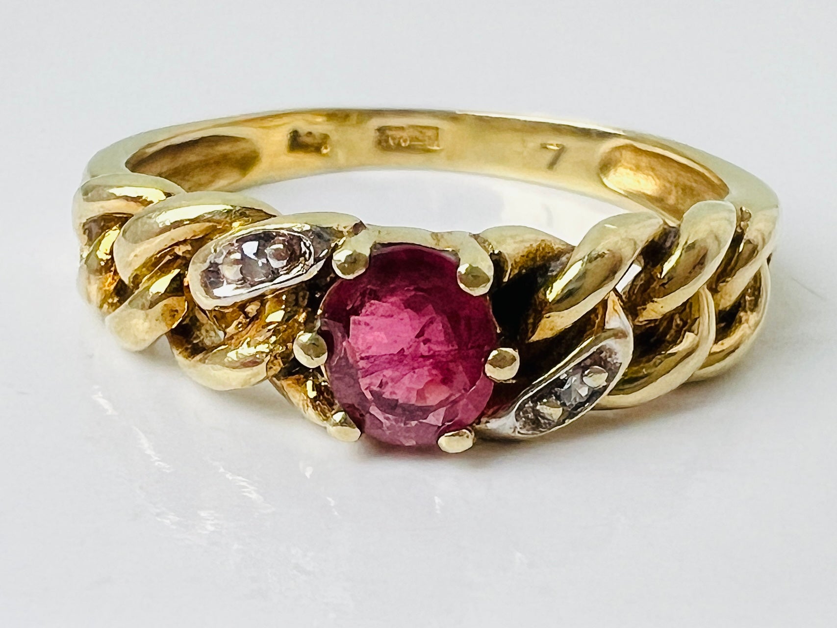 The front of the ring measures 5mm wide and features an oval ruby and two very small round diamonds in a chain link style.