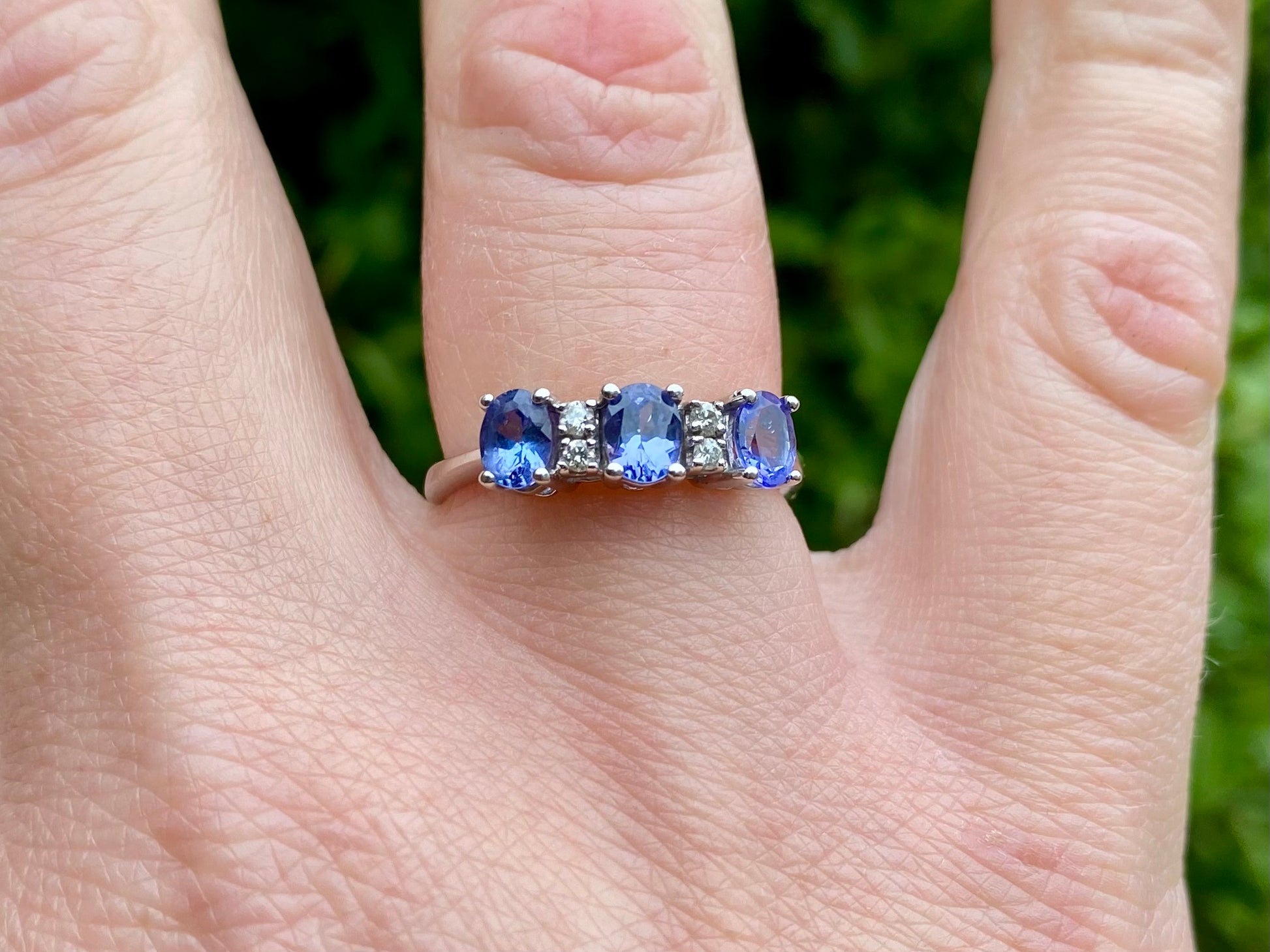 The ring features three oval 5 x 4mm tanzanite's with four round-cut diamonds.