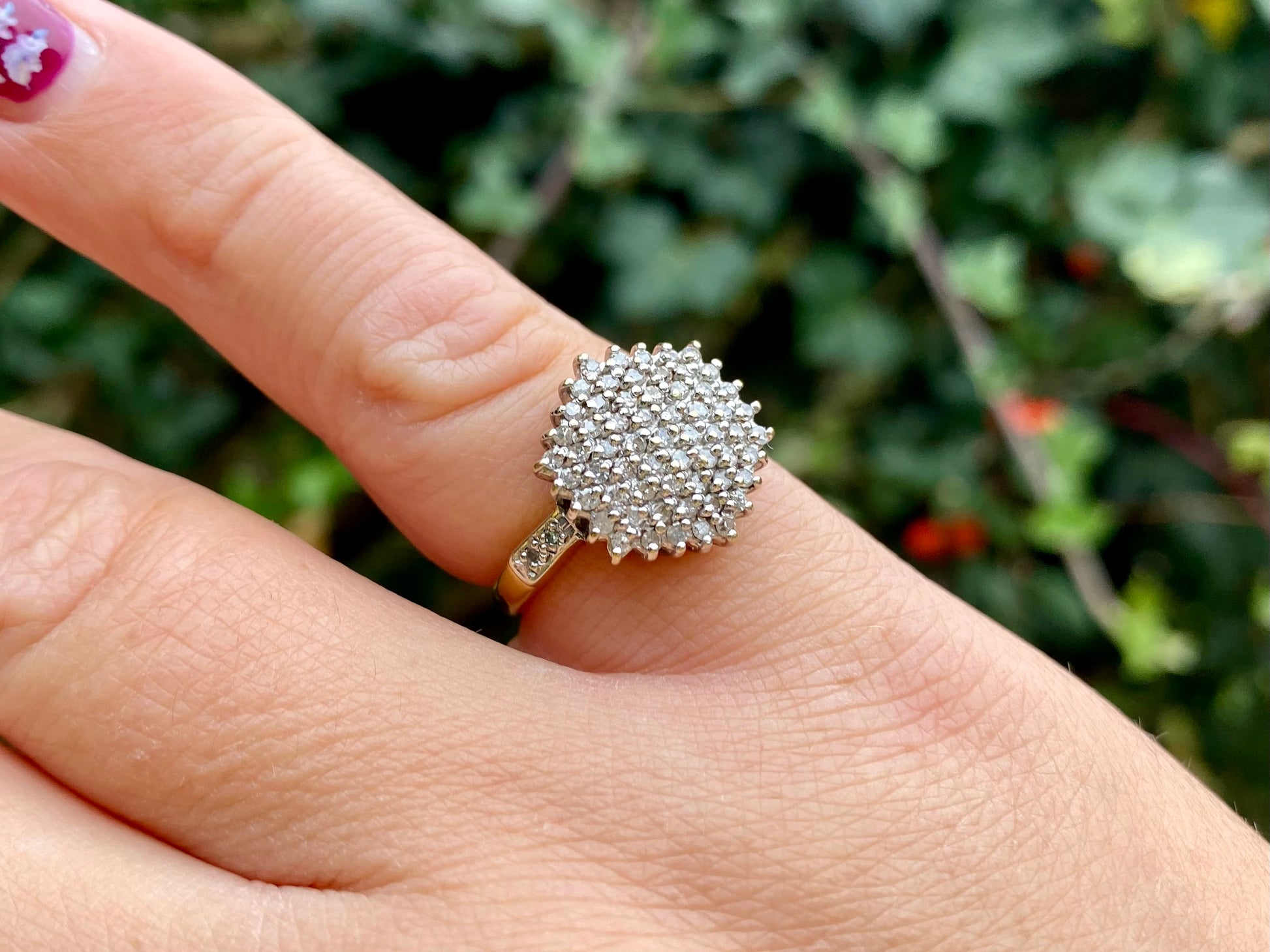 The face of the ring at the front measures 14mm wide and features sixty round-cut diamonds in a hexagon white gold setting with two small round diamonds to each shoulder. Total diamond weight of 0.50cts.
