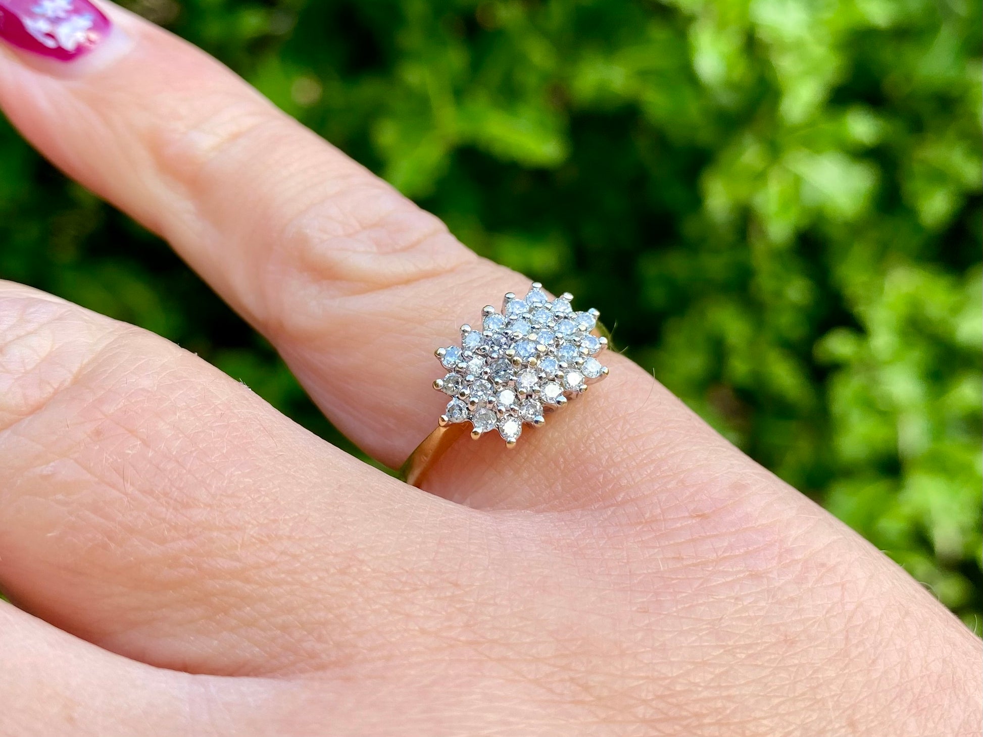 The face of the ring measures 13 x 9mm and features twenty-nine round cut diamonds with a total diamond weight of 0.50cts.