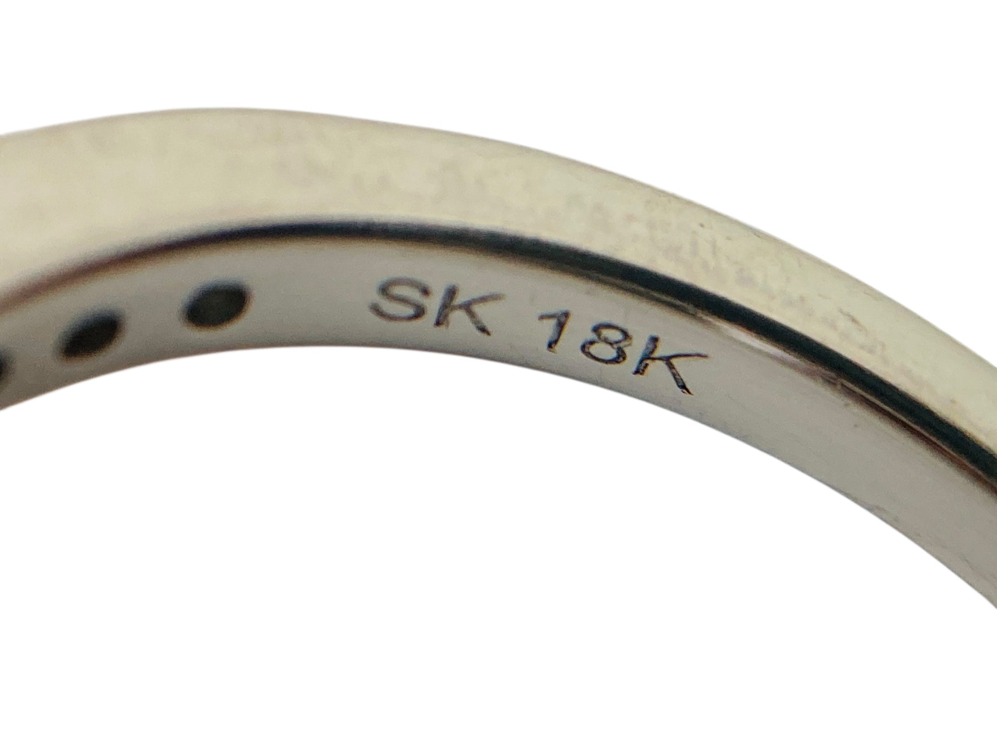 The front of the ring measures 8mm wide features a 3.5mm round-cut diamond with a halo of fourteen smaller round-cut diamonds. Each shoulder of the ring is set with eight round-cut diamonds. Total estimated diamond weight of 0.45cts
