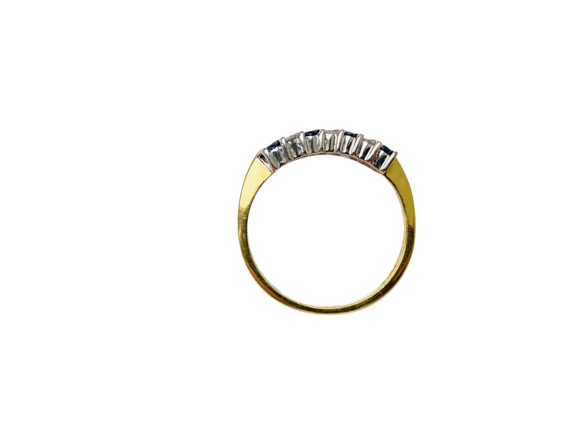 The front of the ring measures 4mm wide and features eight round sapphires, and six round-cut diamonds in a tension setting.