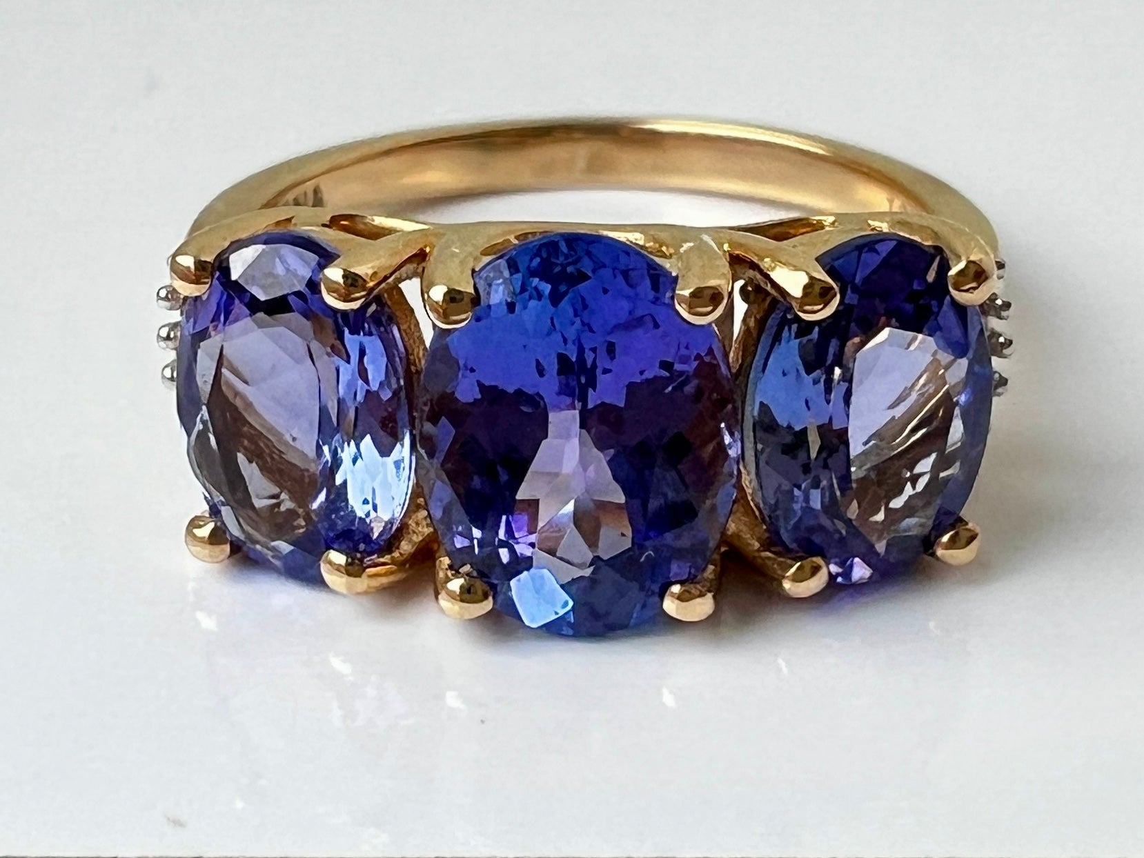 The ring features three oval tanzanite's with five baguette-cut diamonds toe ach shoulder of the ring. The middle tanzanite measures 8 x 6mm. The two side tanzanite's measures 7 x 5mm. Signed for Iliana.