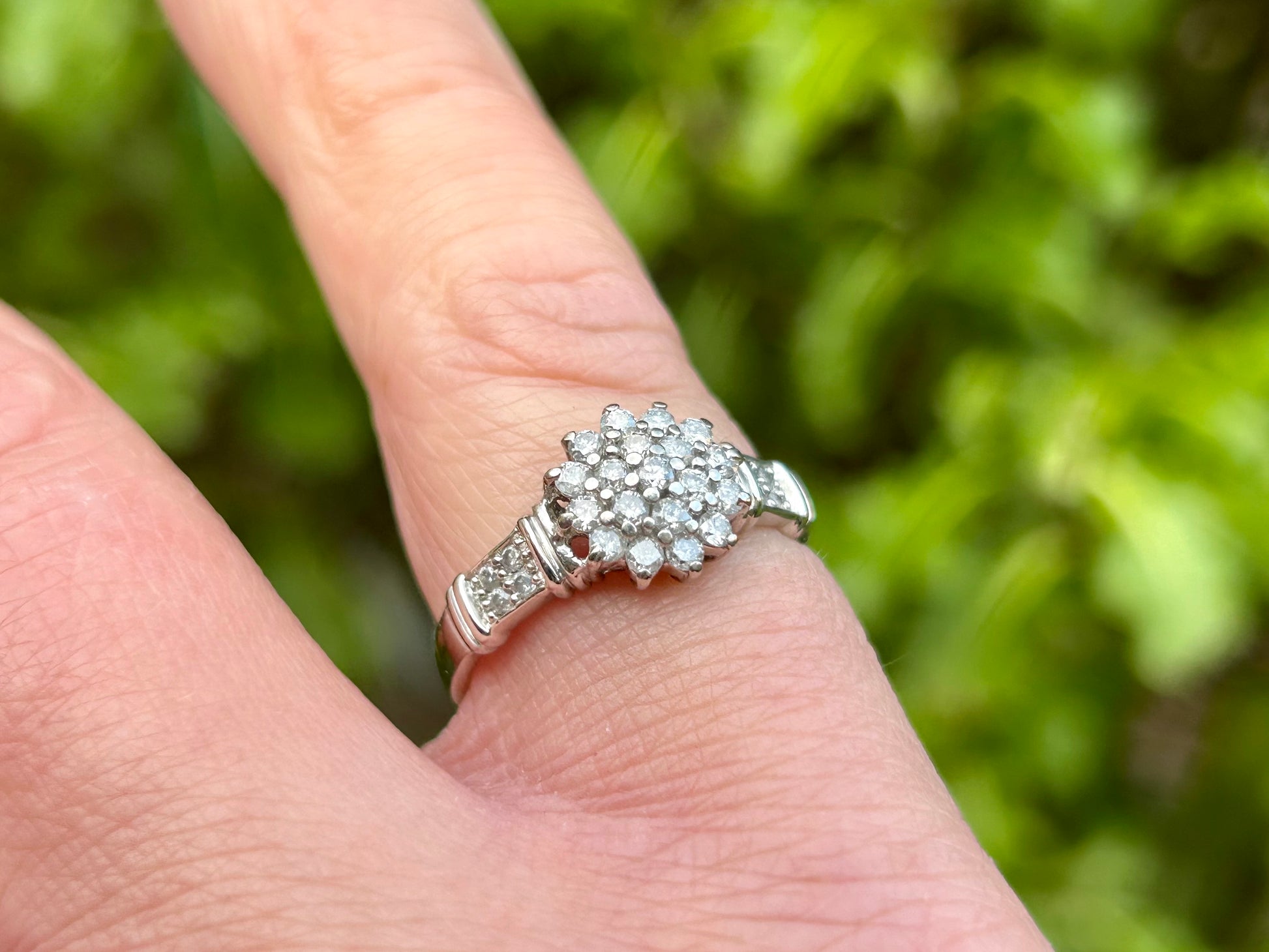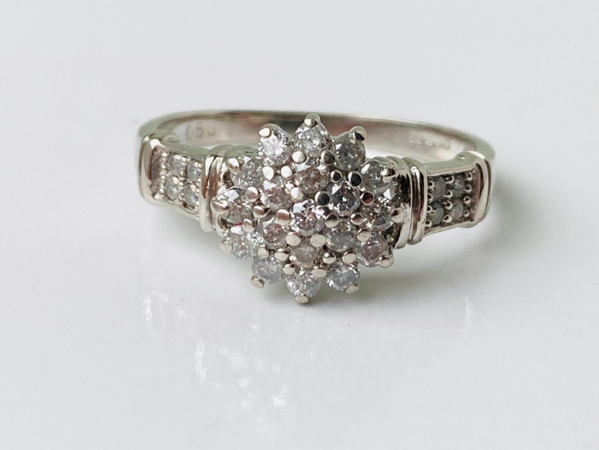 The face of the ring measures 9mm wide and features nineteen round diamonds to the cluster with four round-cut diamonds to each shoulder of the ring. Total diamond carat weight of 0.50cts.