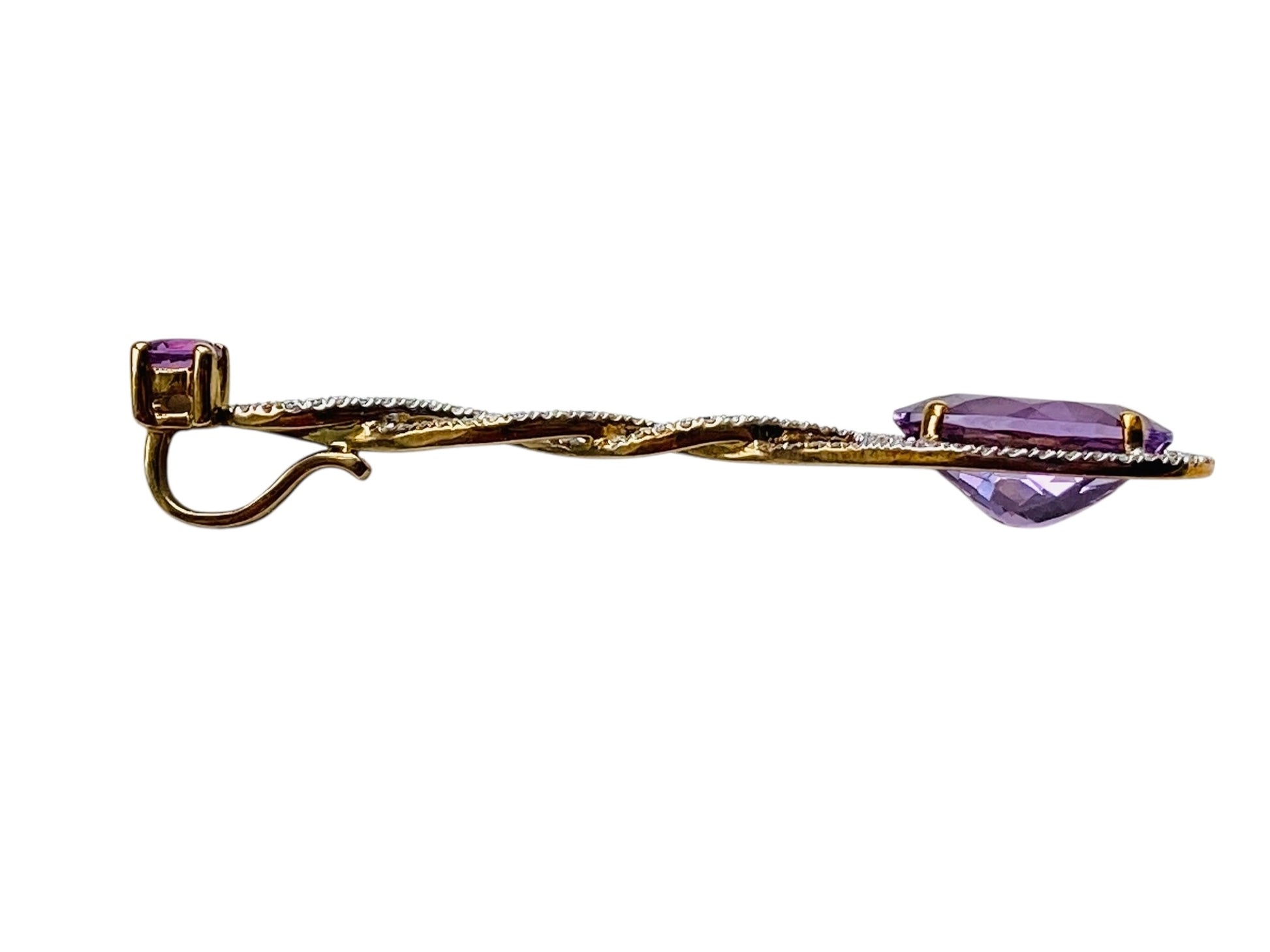 The pendant fetaures a 13 x 9mm oval amethyst, one round-cut amethyst and ninety-two small round diamonds.