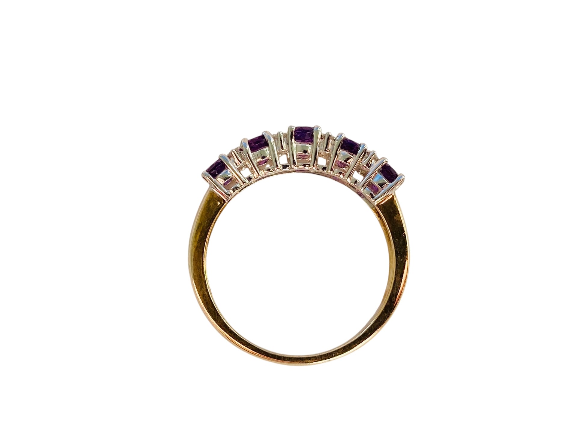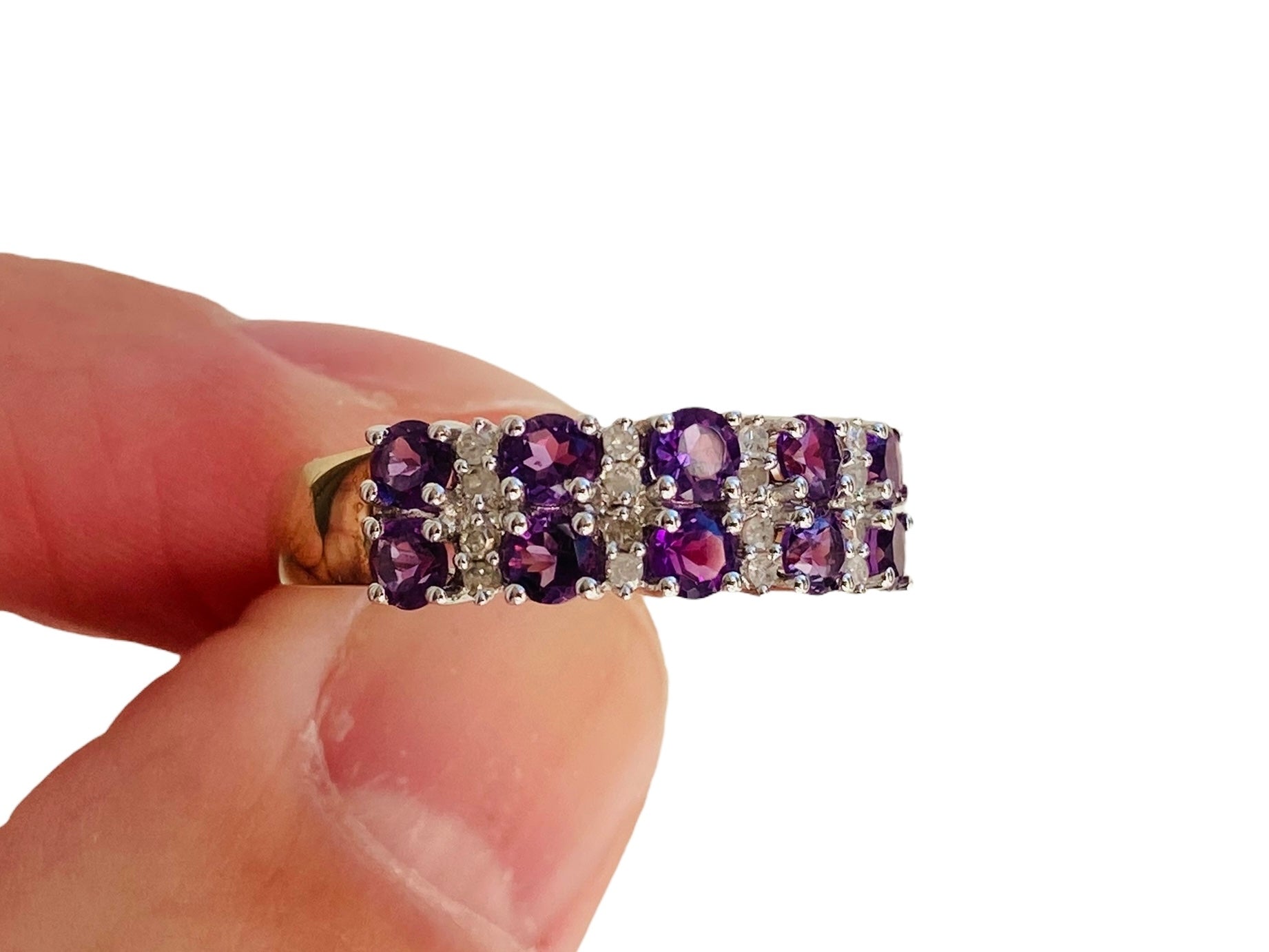 The front of the ring measures 6mm wide and features ten round amethyst's and sixteen round diamonds