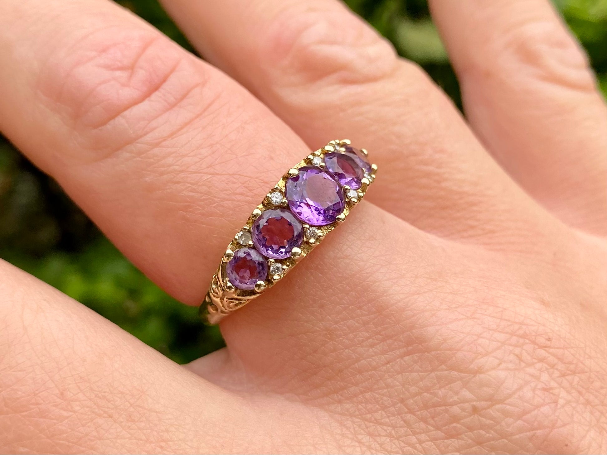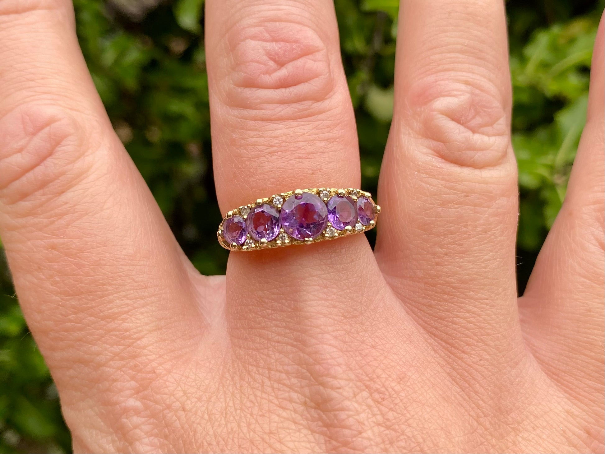 The front of the ring measures 7mm wide and features five round amethyst's and eight small round diamonds.