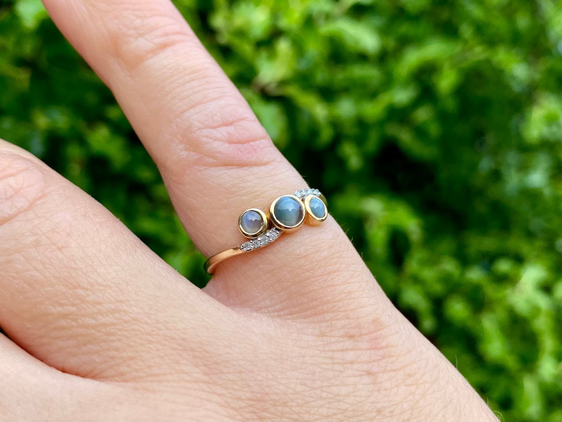 The ring features three round cabochon cats eyes. The middle cats eye measures 4.5mm wide. With four round diamonds to each shoulder of the ring.