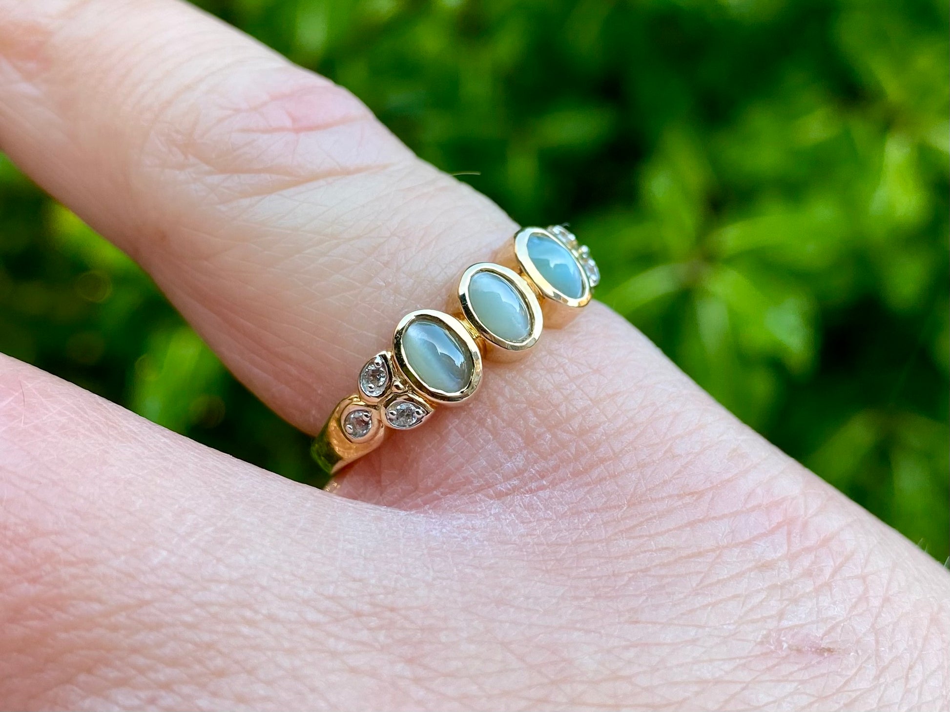 The ring features three oval 4 x 3mm cabochon cats eyes with three small round white sapphires to each shoulder of the ring.