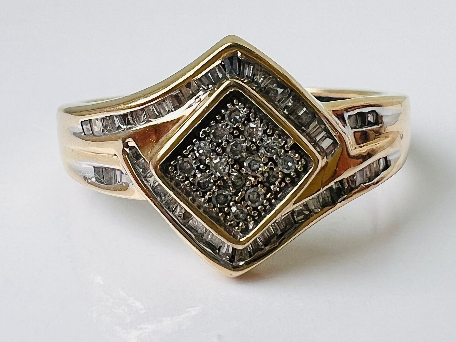 Marked for 9ct gold and has been XRF tested for 9ct gold. Marked for 0.25cts of diamonds.
