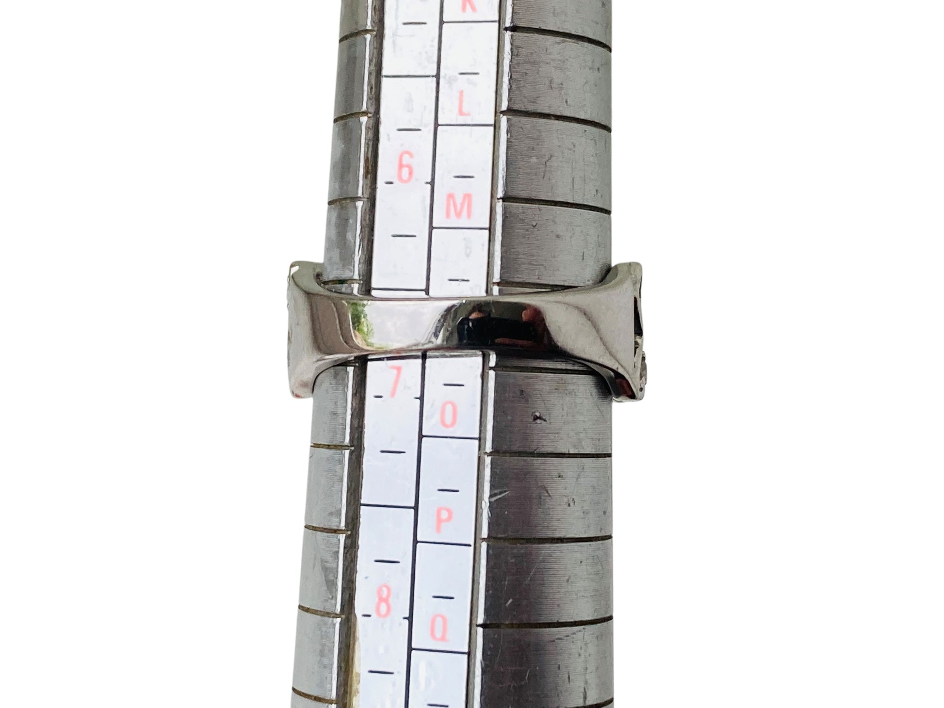 The front of the ring measures 8mm wide and tapers down to 3mm wide at the back of the band. The ring is set with eight round-cut diamonds in a heart filigree setting.