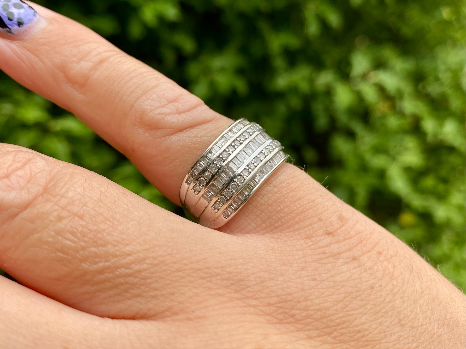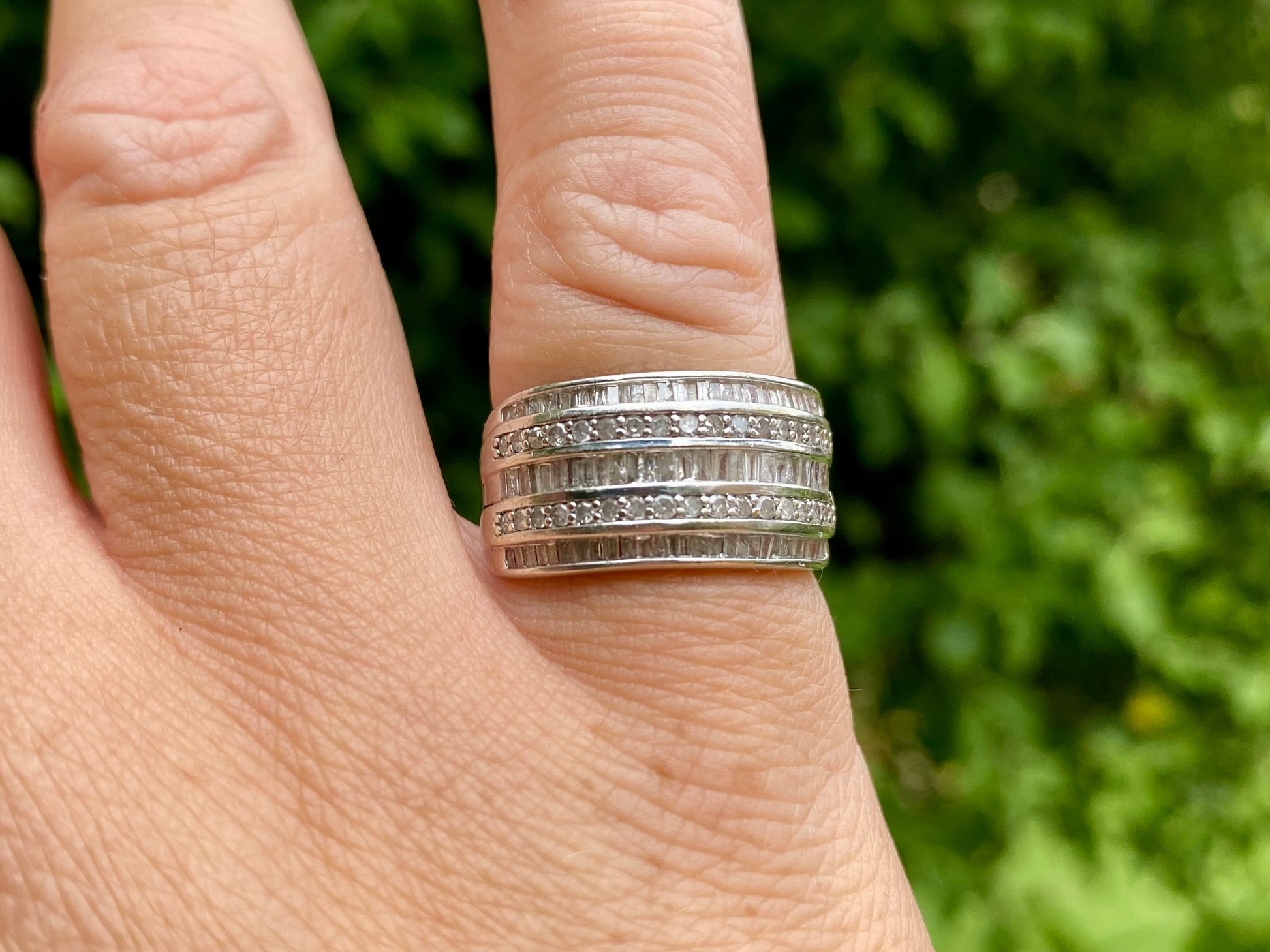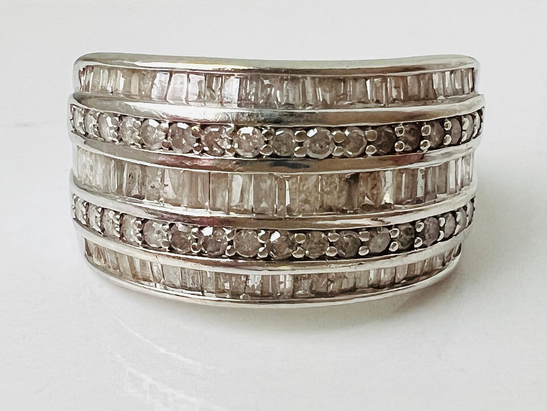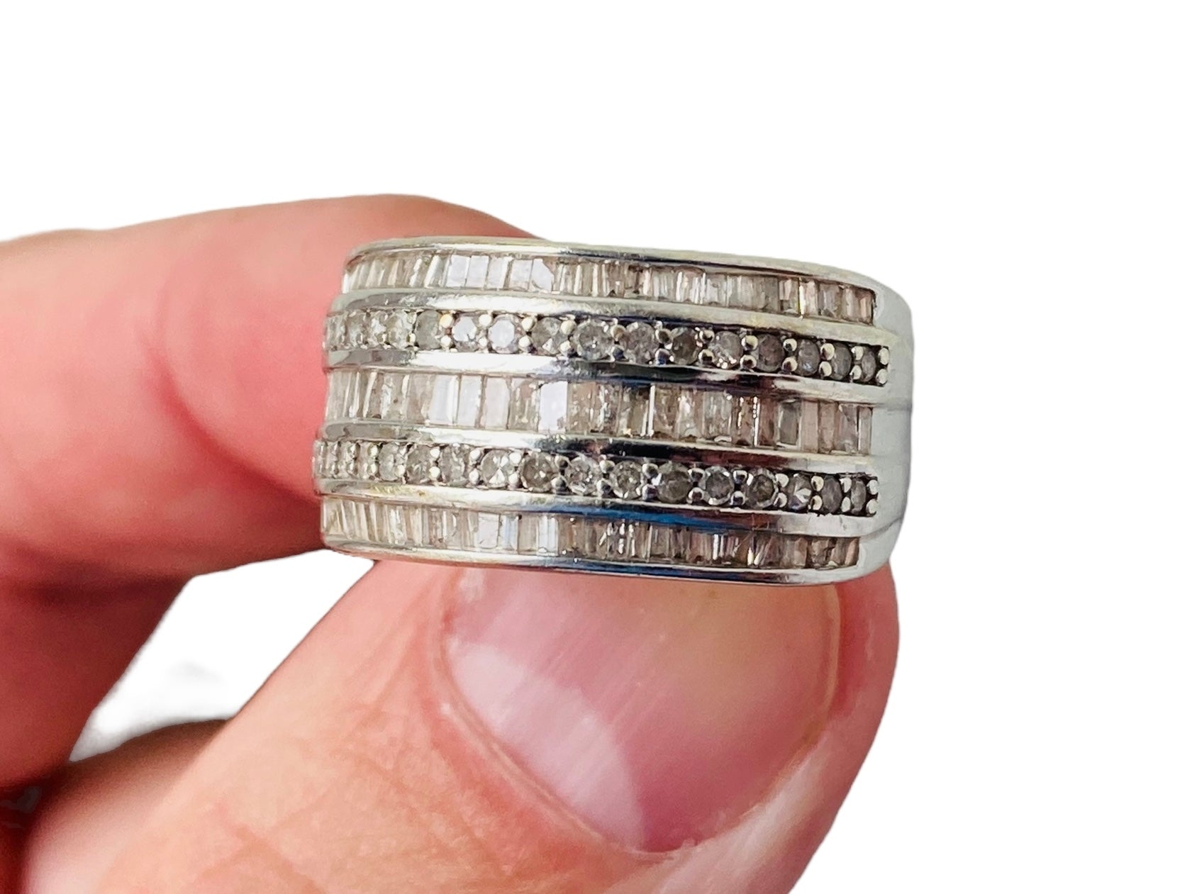 The front of the ring measures 10mm wide and tapers down to 2mm wide at the back of the band. The ring baguette and round-cut diamonds. Estimated total diamond weight of 0.75cts.