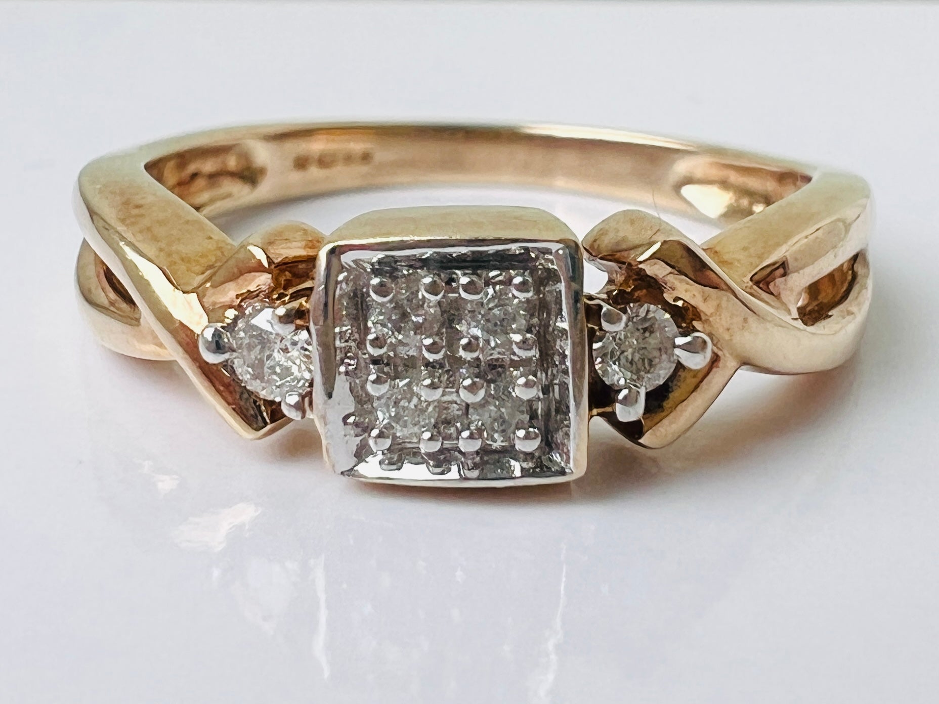 The front of the ring measures 5mm and features four round-cut diamonds in a white gold setting with a larger round-cut diamond to each shoulder of the ring.