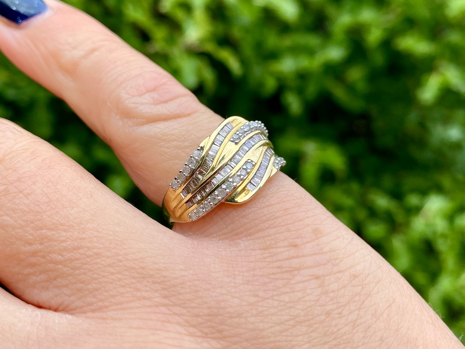 The face of the ring measures 20 x 13mm and features round and baguette cut diamonds. Estimated total diamond weight of 0.60cts.