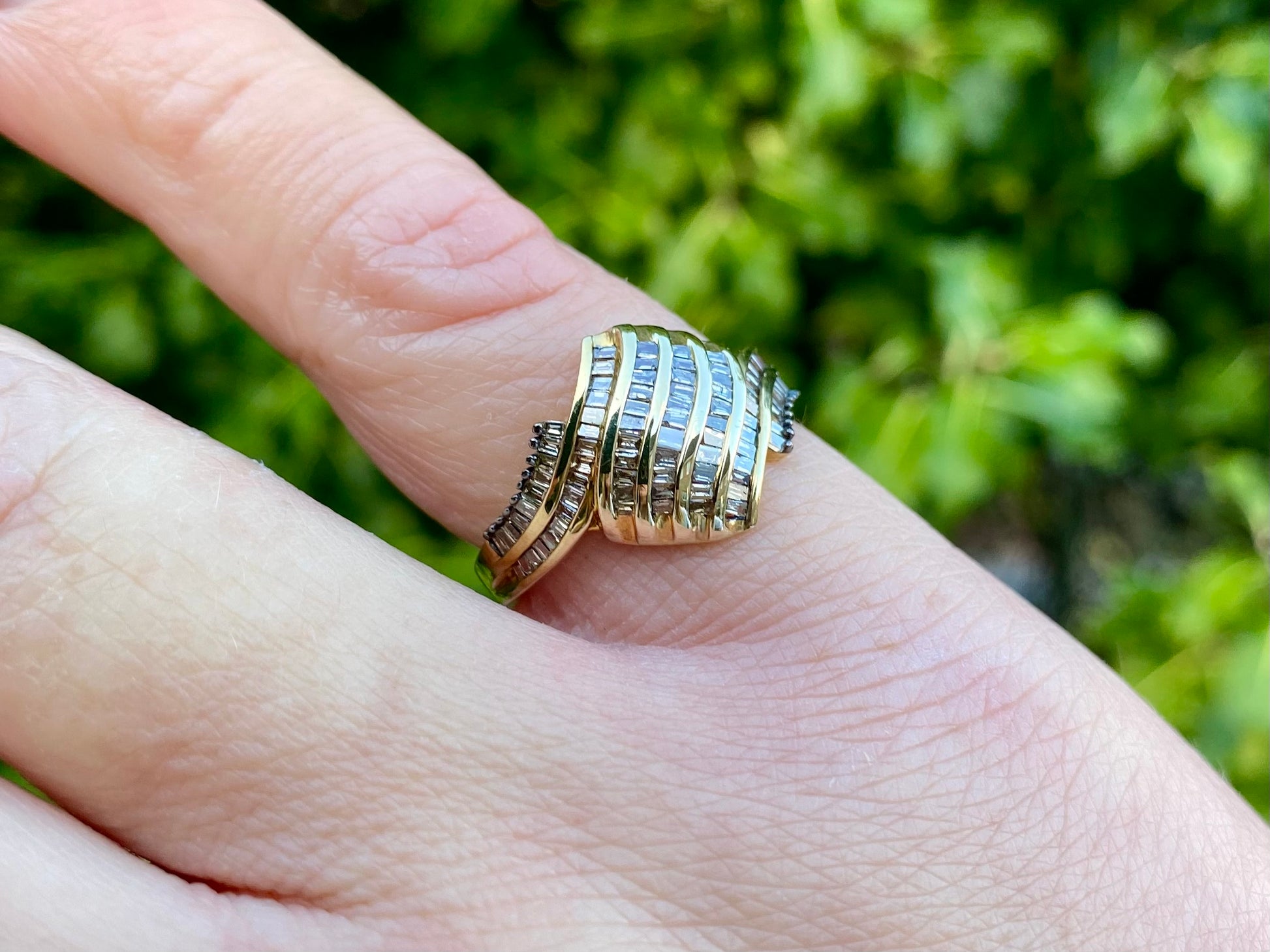 The front of the ring measures 14mm wide and features eighty-nine baguette-cut diamonds. The border to the baguette diamonds on each shoulder is set with black enamel to the milgrain design. Estimated total diamond weight 0.80cts.
