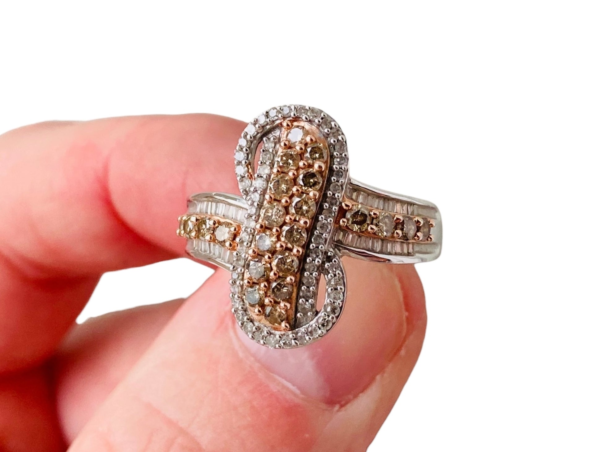 The front of the ring measures 19mm wide featuring round-cut champagne diamonds, small round white diamonds, and white baguette-cut diamonds. Estimated total diamond weight of 0.75cts.