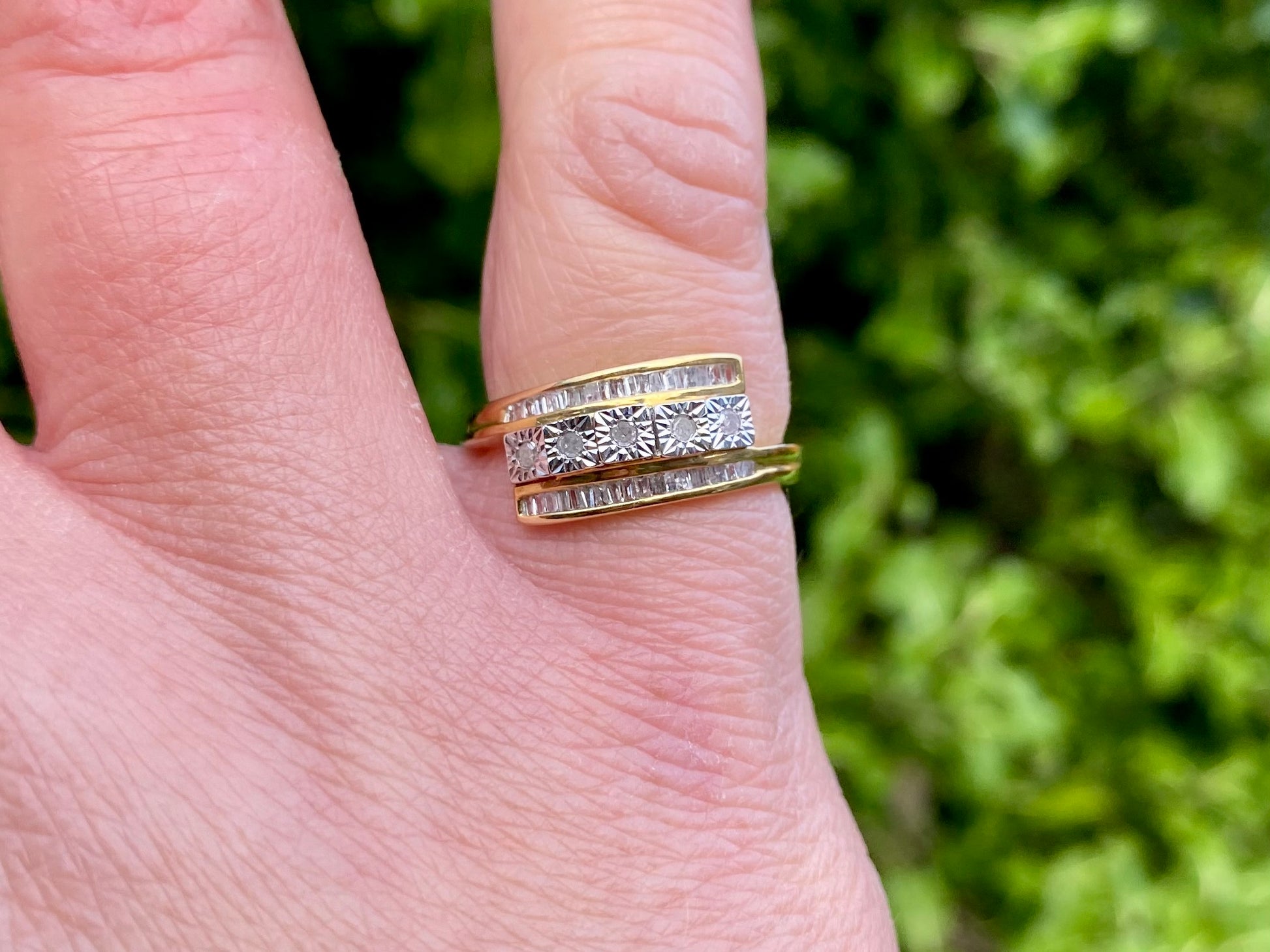 The front of the ring measures 7.5mm wide and features five illusion set round diamonds and two rows of twenty baguette-cut diamonds.