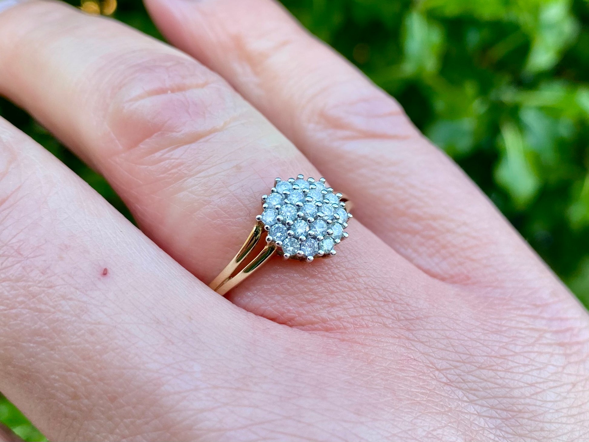 The face of the ring measures 10mm wide and features nineteen round-cut diamonds. Total estimated diamond weight of 0.50cts.