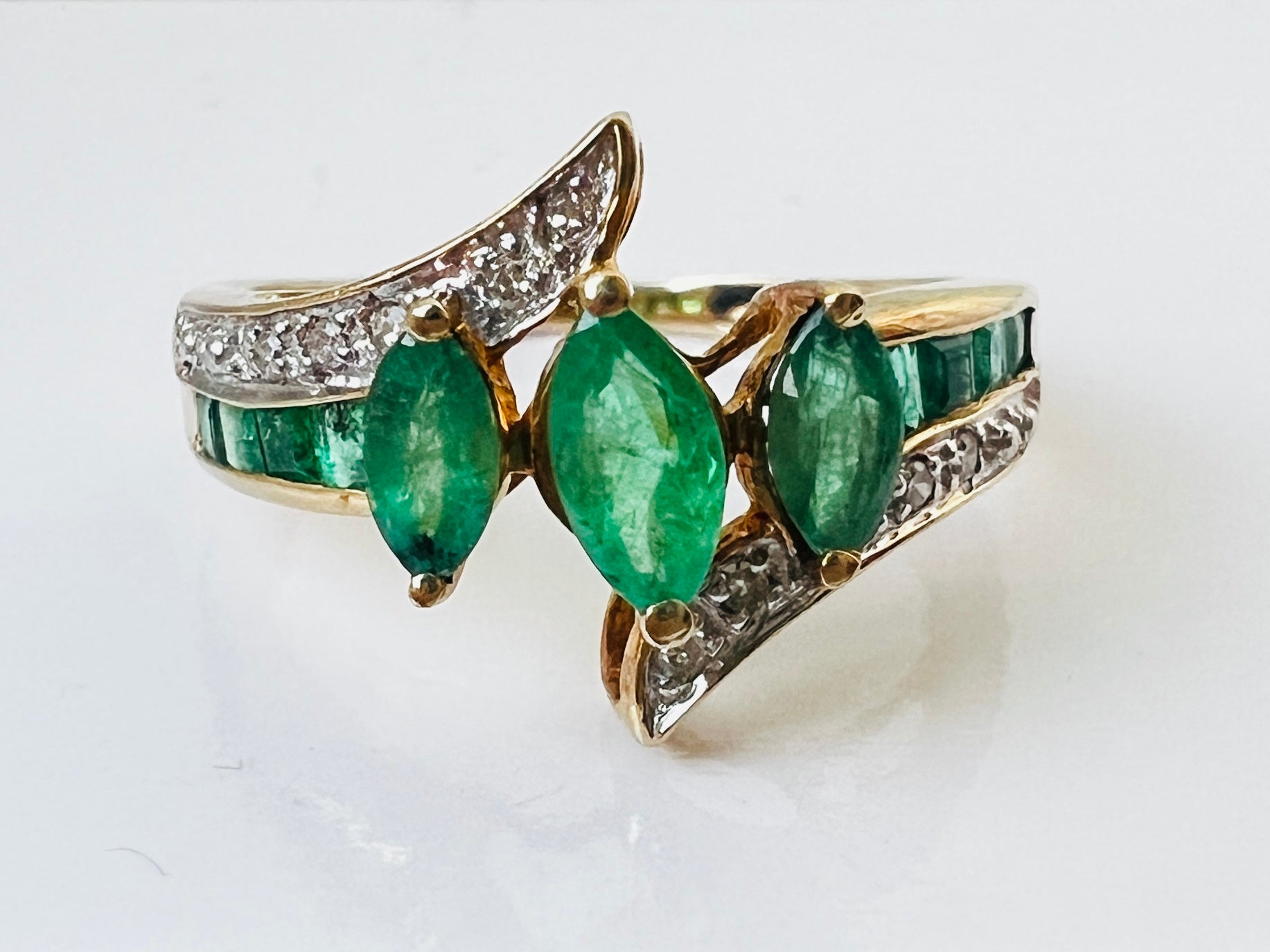 The front of the ring measures 12mm wide and features three marquise-cut emeralds, (the middle emerald measures 6 x 3mm). With eight princess-cut emeralds and ten round diamonds.