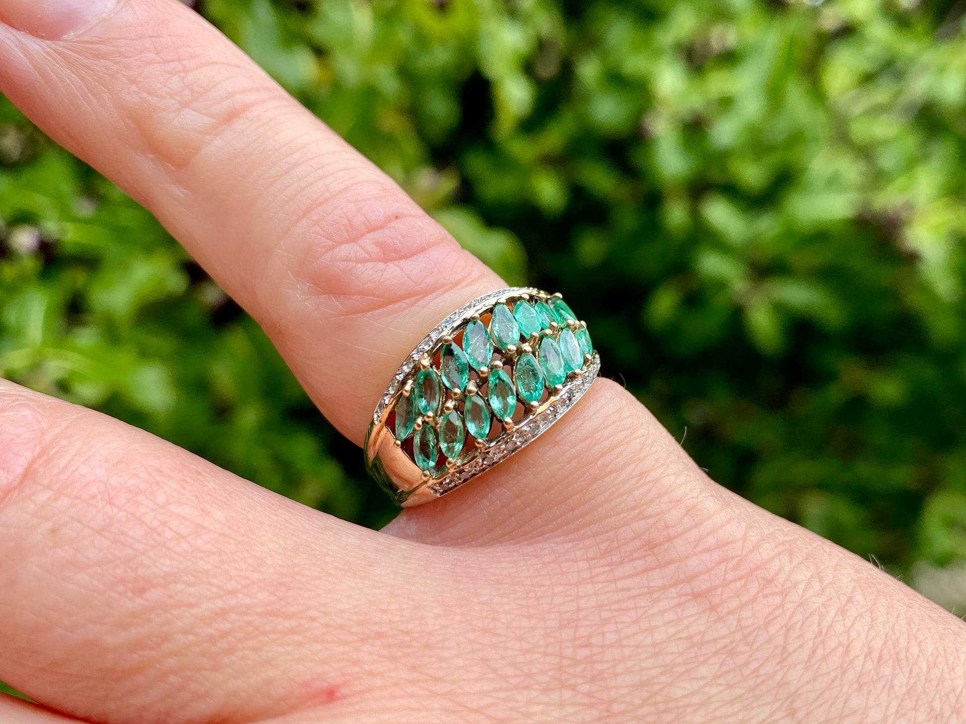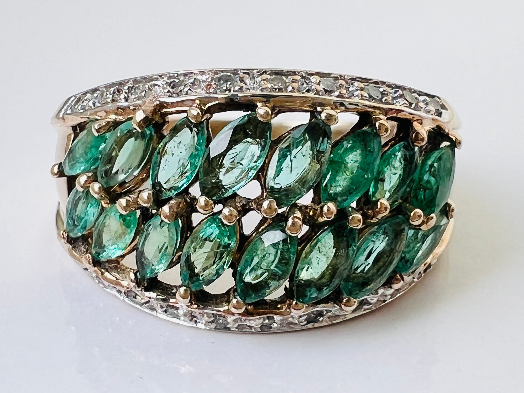 The face of the ring measures 17 x 11mm and features sixteen marquise-cut emeralds and twenty small round diamonds.