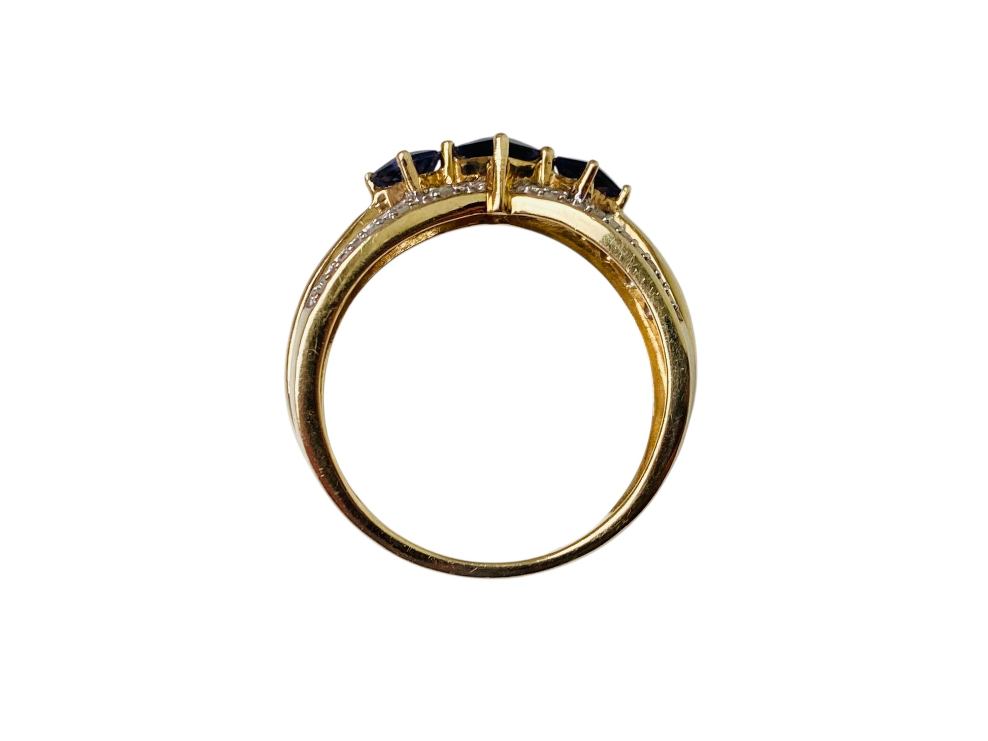 The ring features three princes cut iolites and twenty round diamonds. The front of the ring measures 5mm wide with the sides of the ring measuring 7mm wide.