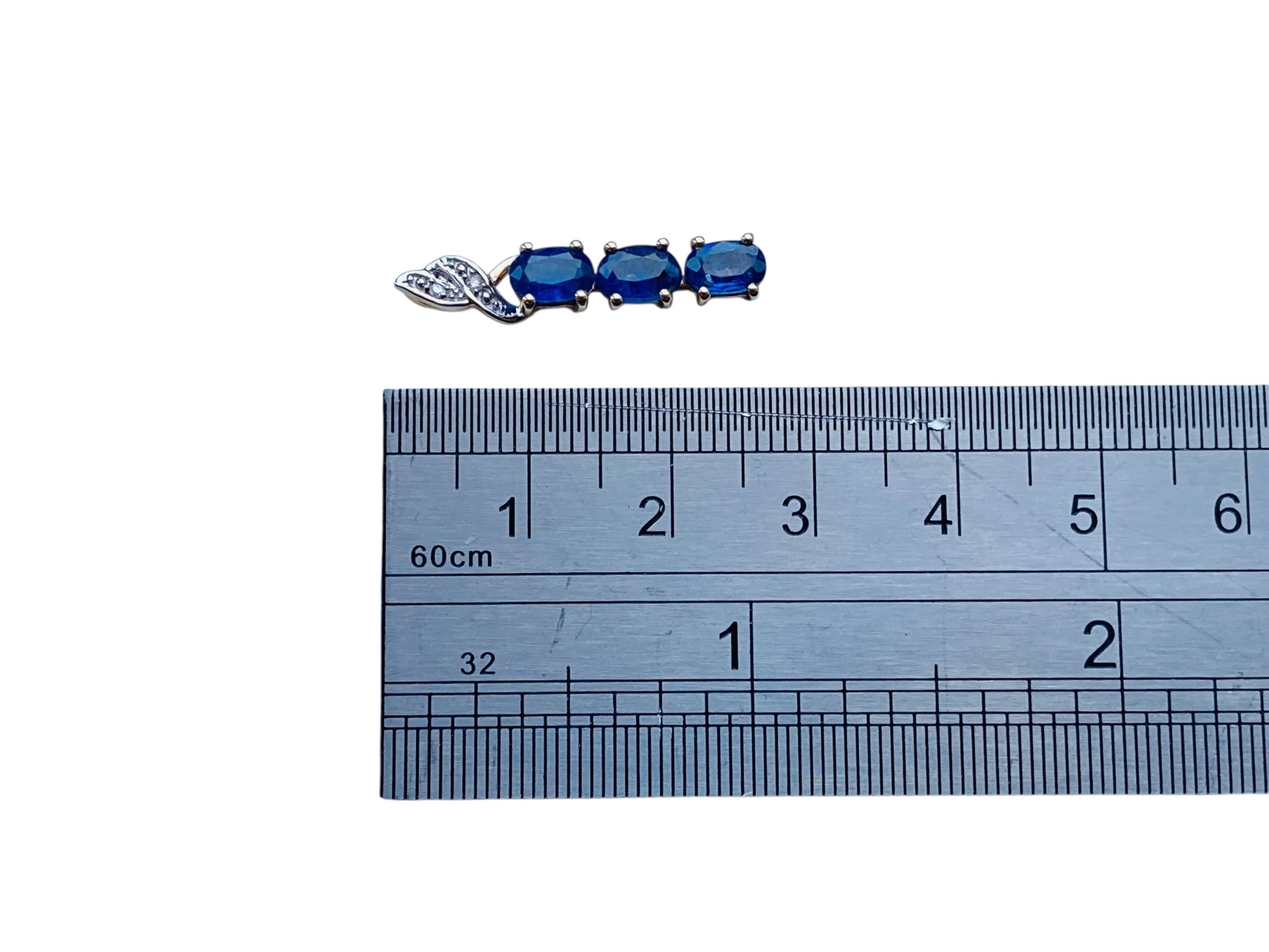 The pendant features a three oval 6 x 4mm kyanite with two small round diamonds.