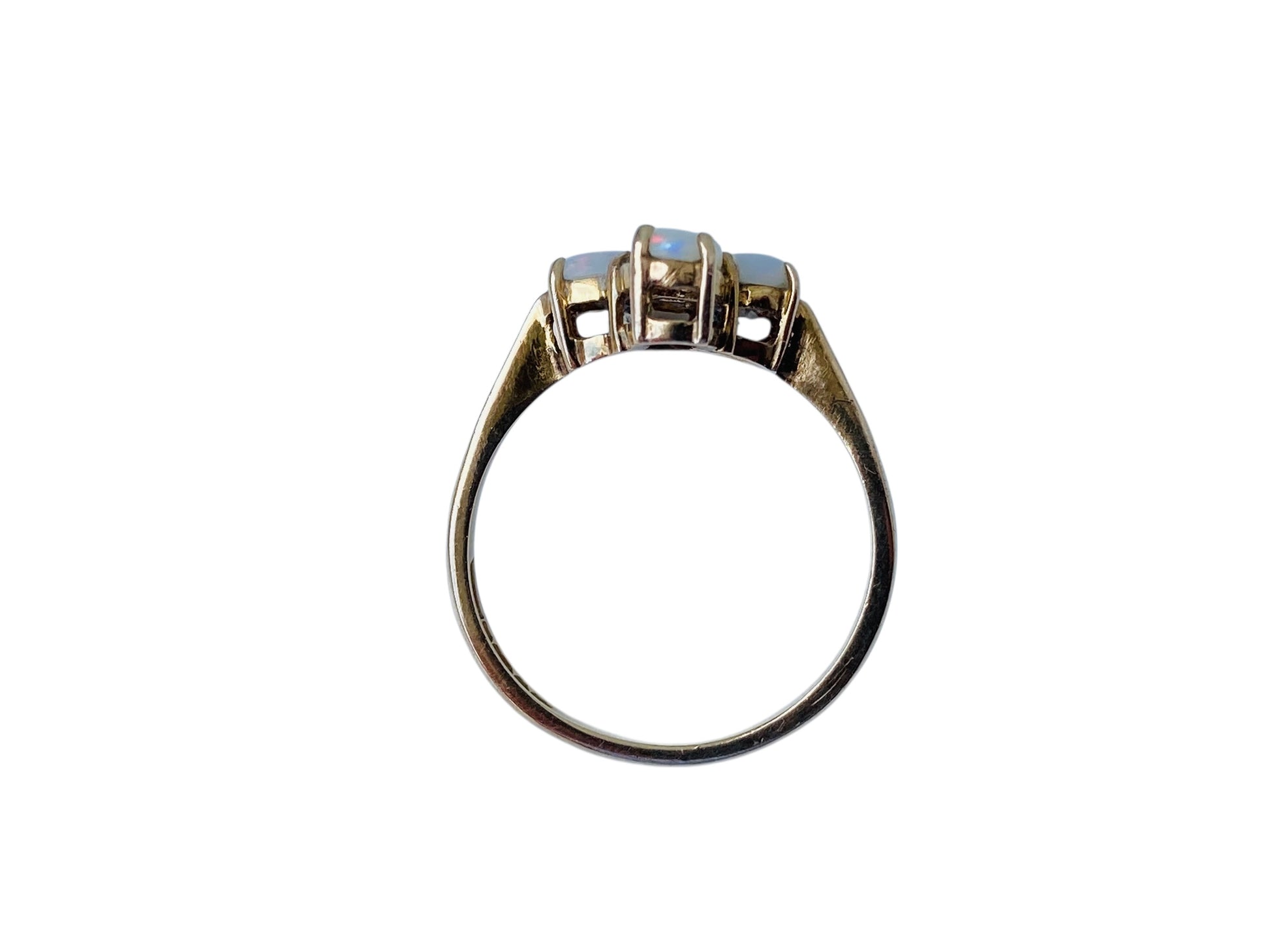 The face of the ring measures 14 x 11mm and features four oval opals with one round-cut diamond.