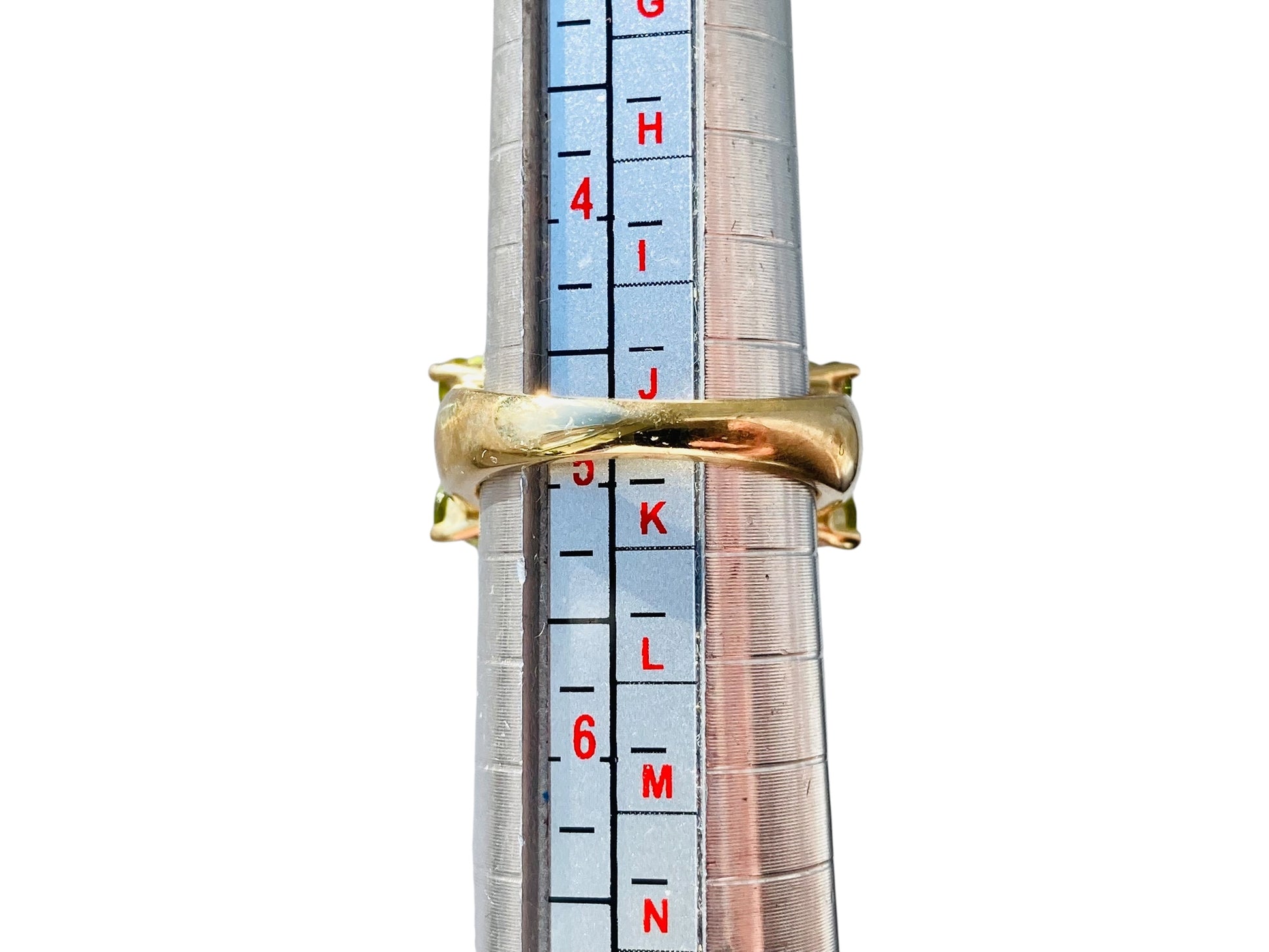 The face of the ring measures 20 x 11mm, and features eight heart shaped peridot, three princess-cut peridot, and eight small round diamonds.