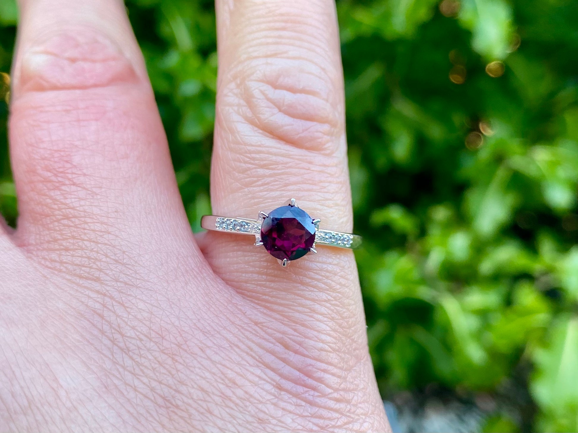 The ring features a 6mm round-cut rhodolite garnet with four round white zircon to each shoulder of the ring, and three round white zircon to each side of the bridge of the ring.