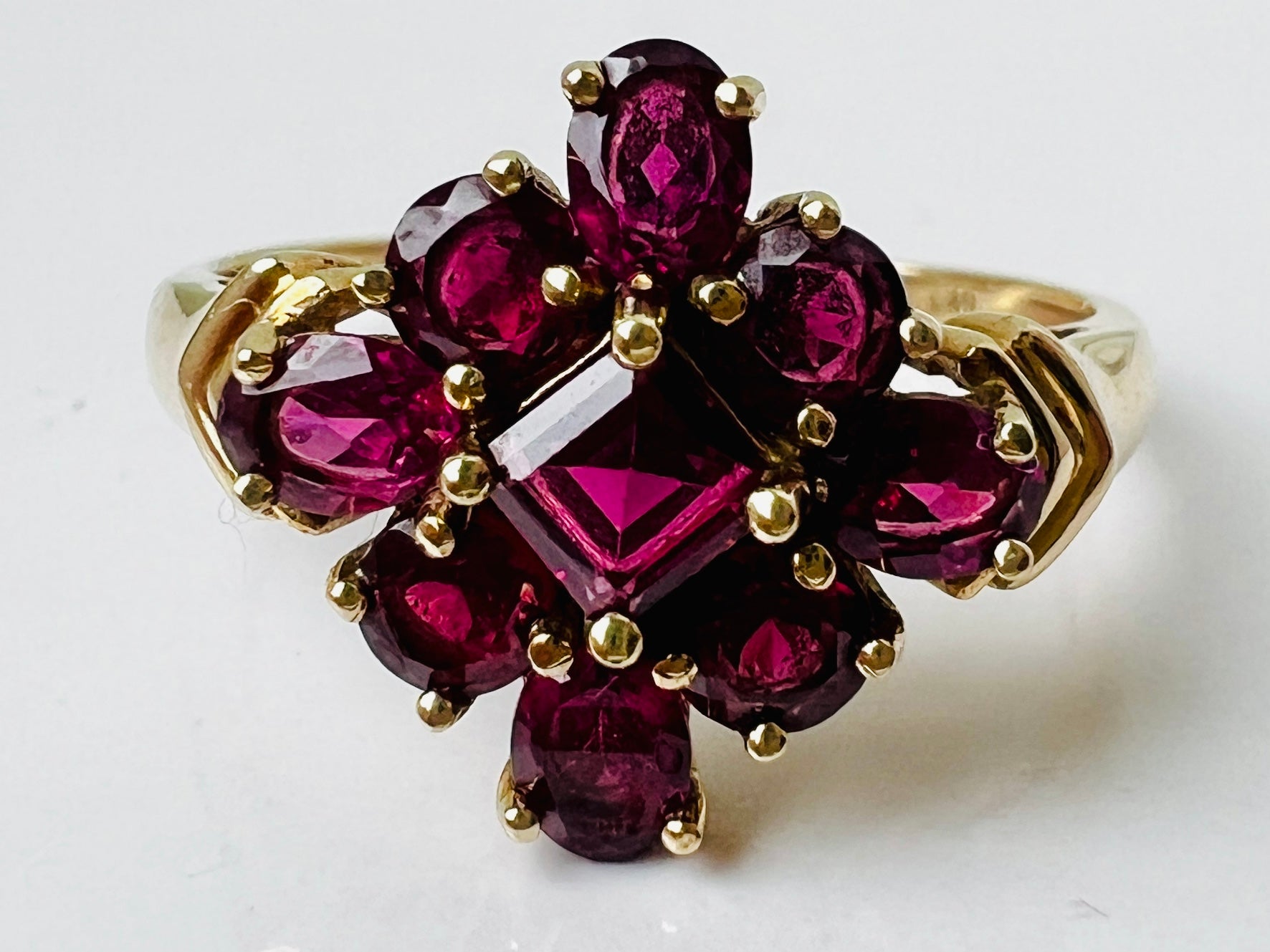 The face of the ring measures 14 x 14mm and features four oval, four round, and one princess-cut rhodolite garnet.