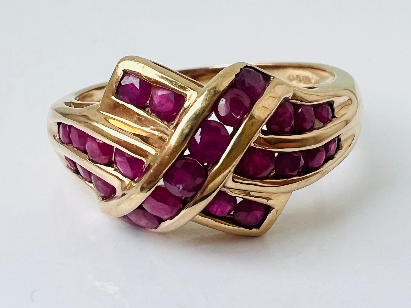 The front of the ring measures 10mm wide and features twenty-four rubies in a crossover setting.