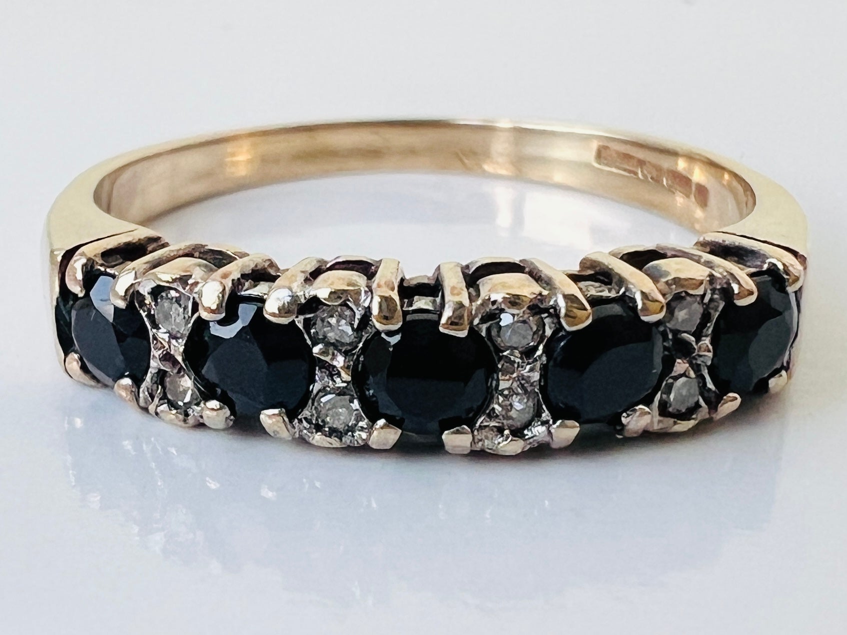 The front of the ring measures 4mm wide and is set with five round dark sapphires and eight small round diamonds.