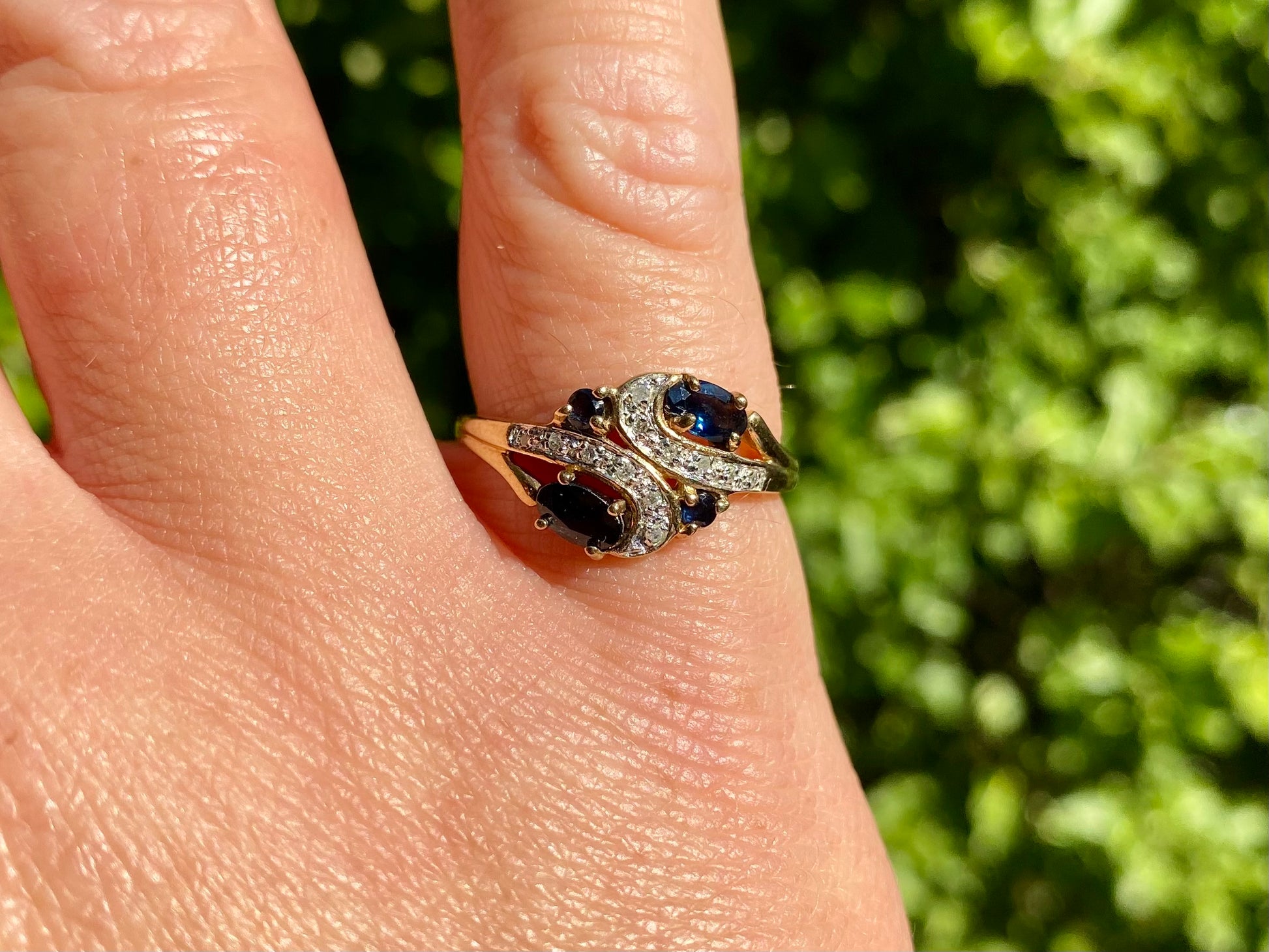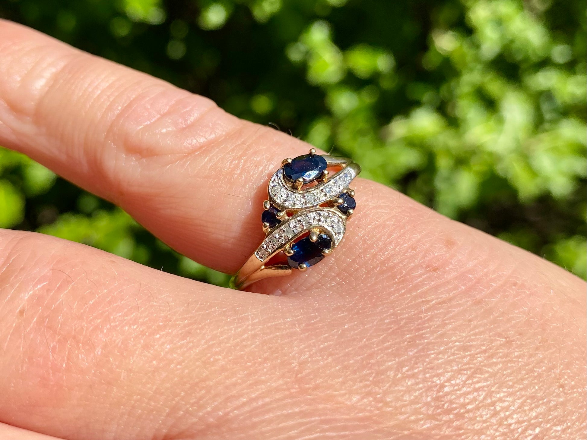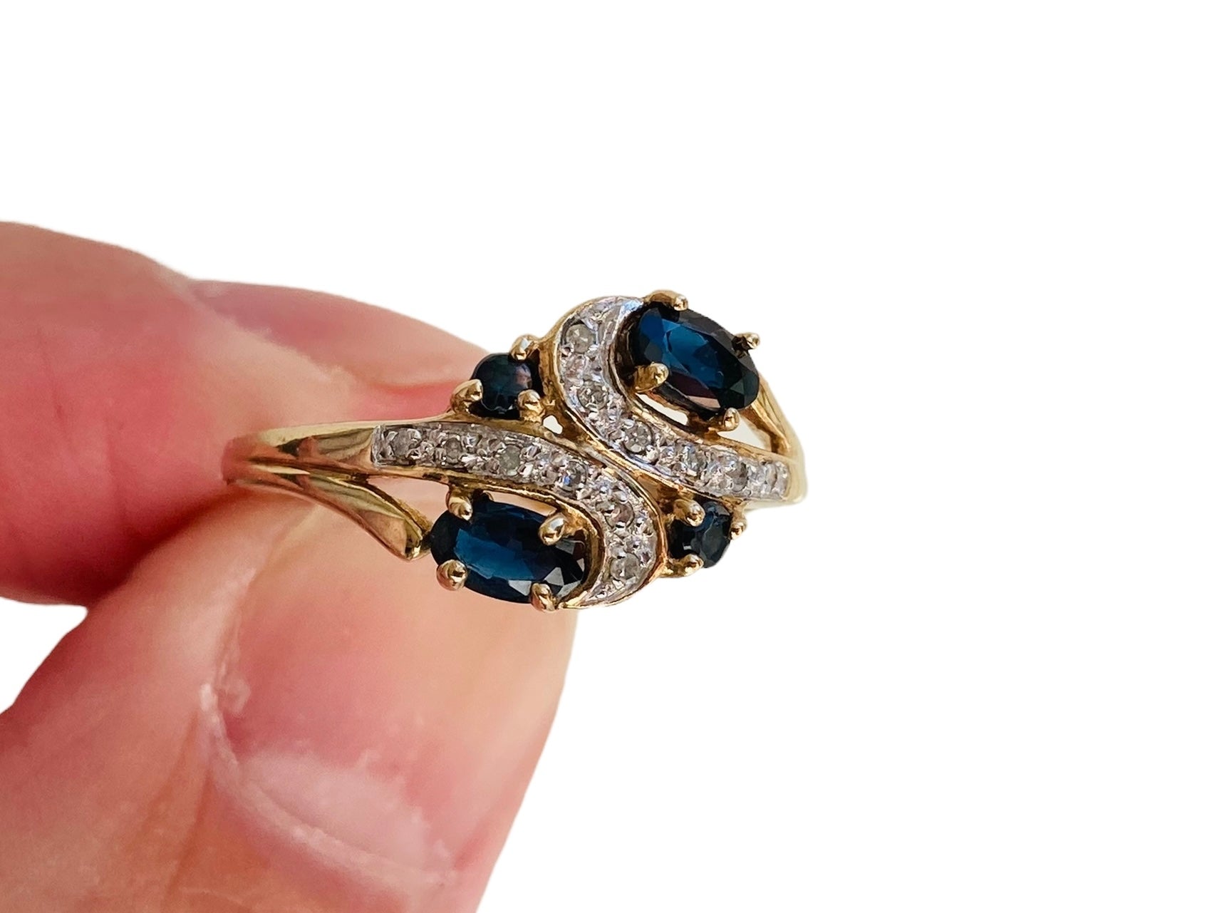 The front of the ring measures 10mm wide and features two oval sapphires, two round sapphires and twelve round diamonds set into white gold. The band of the ring is yellow gold.