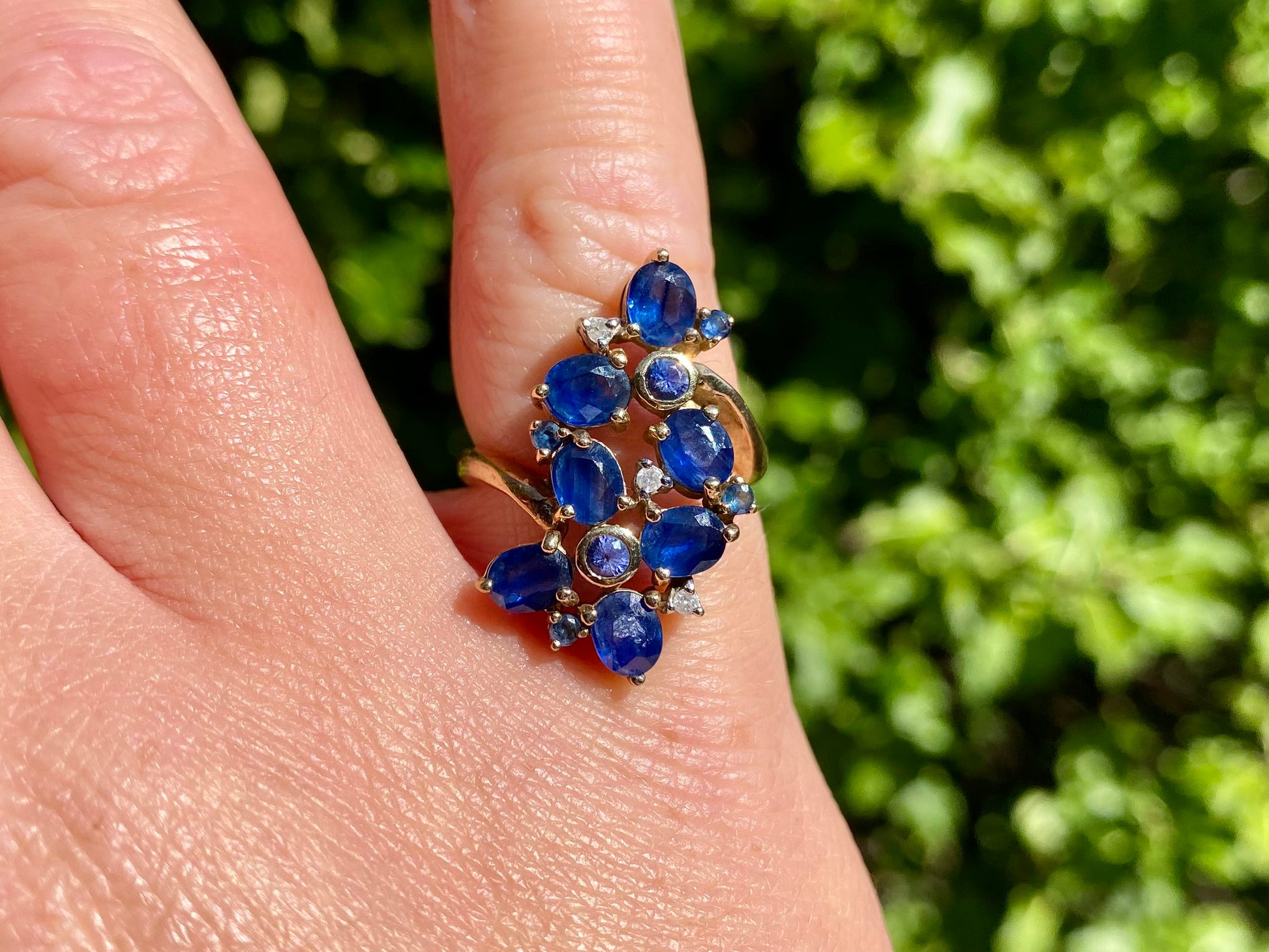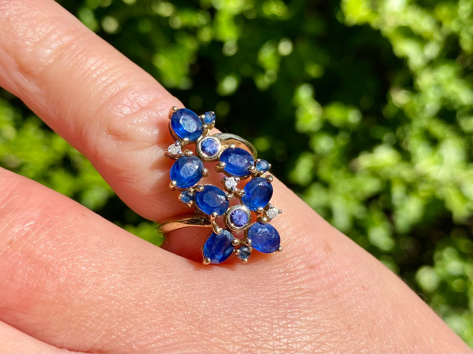 The face of the ring measures 25 x 14mm wide and round and oval sapphires and three round cut diamonds.