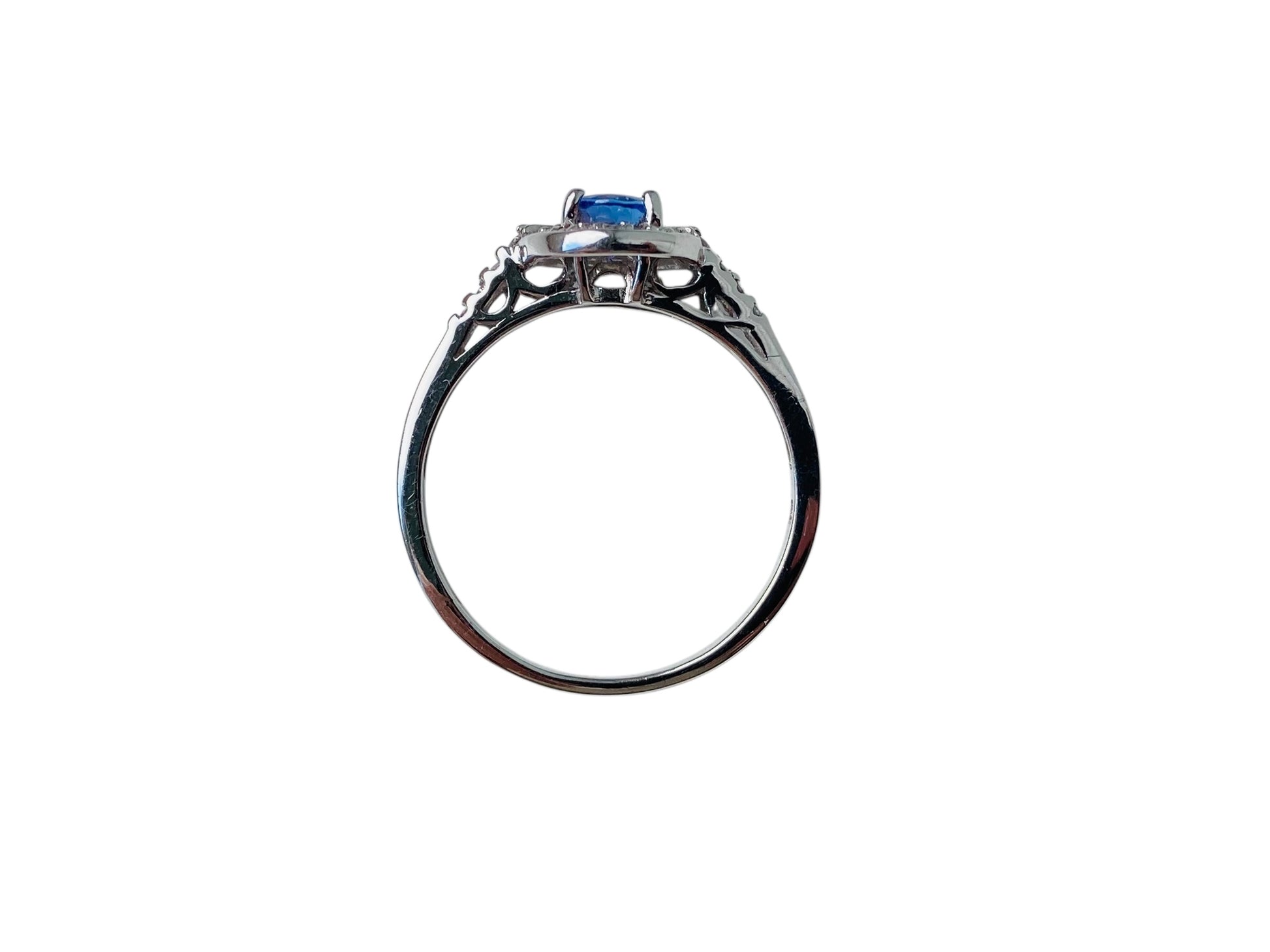 The face of the ring measures 10 x 8mm and features a 6 x 4mm oval tanzanite and twenty two round diamonds.