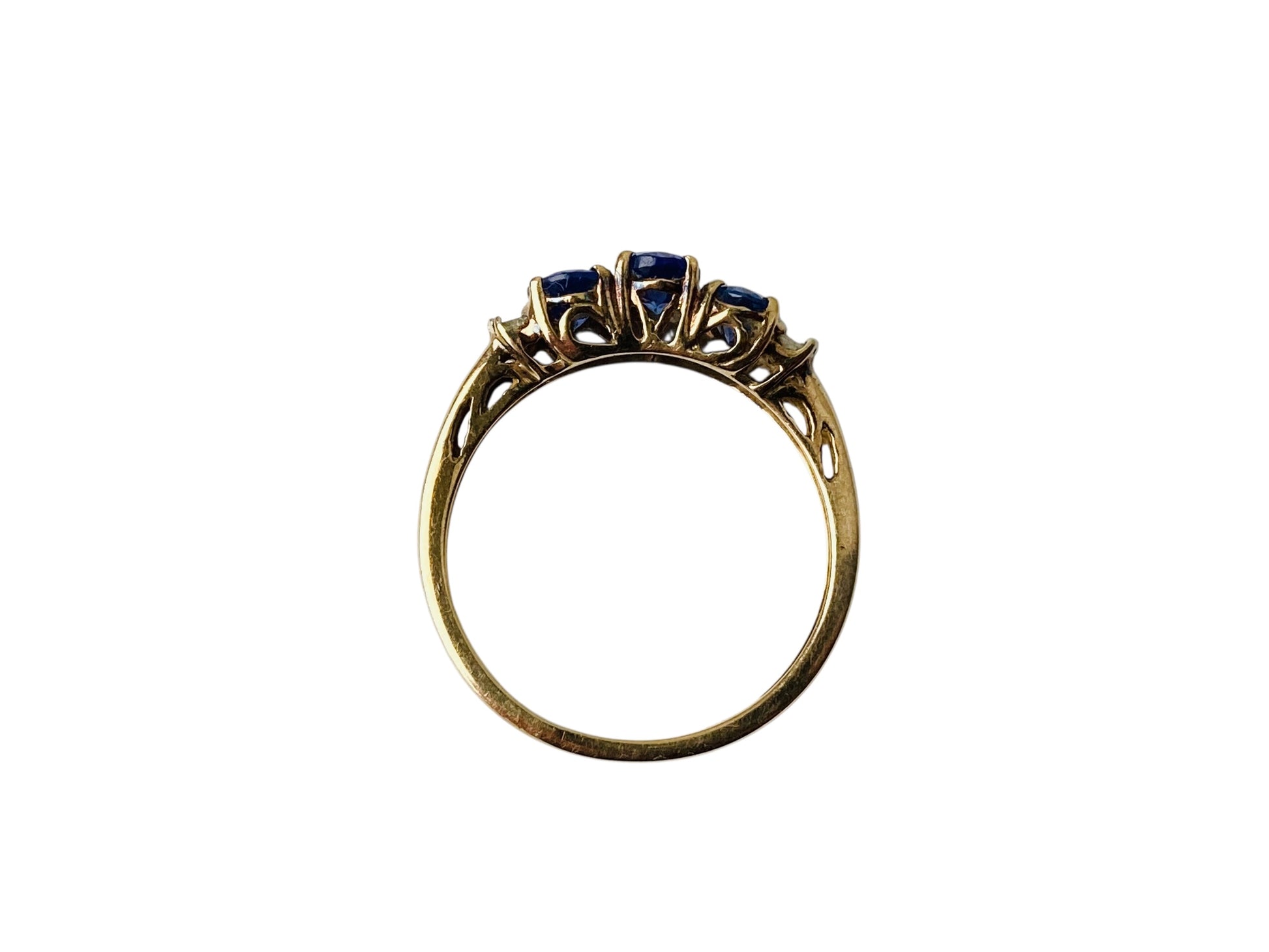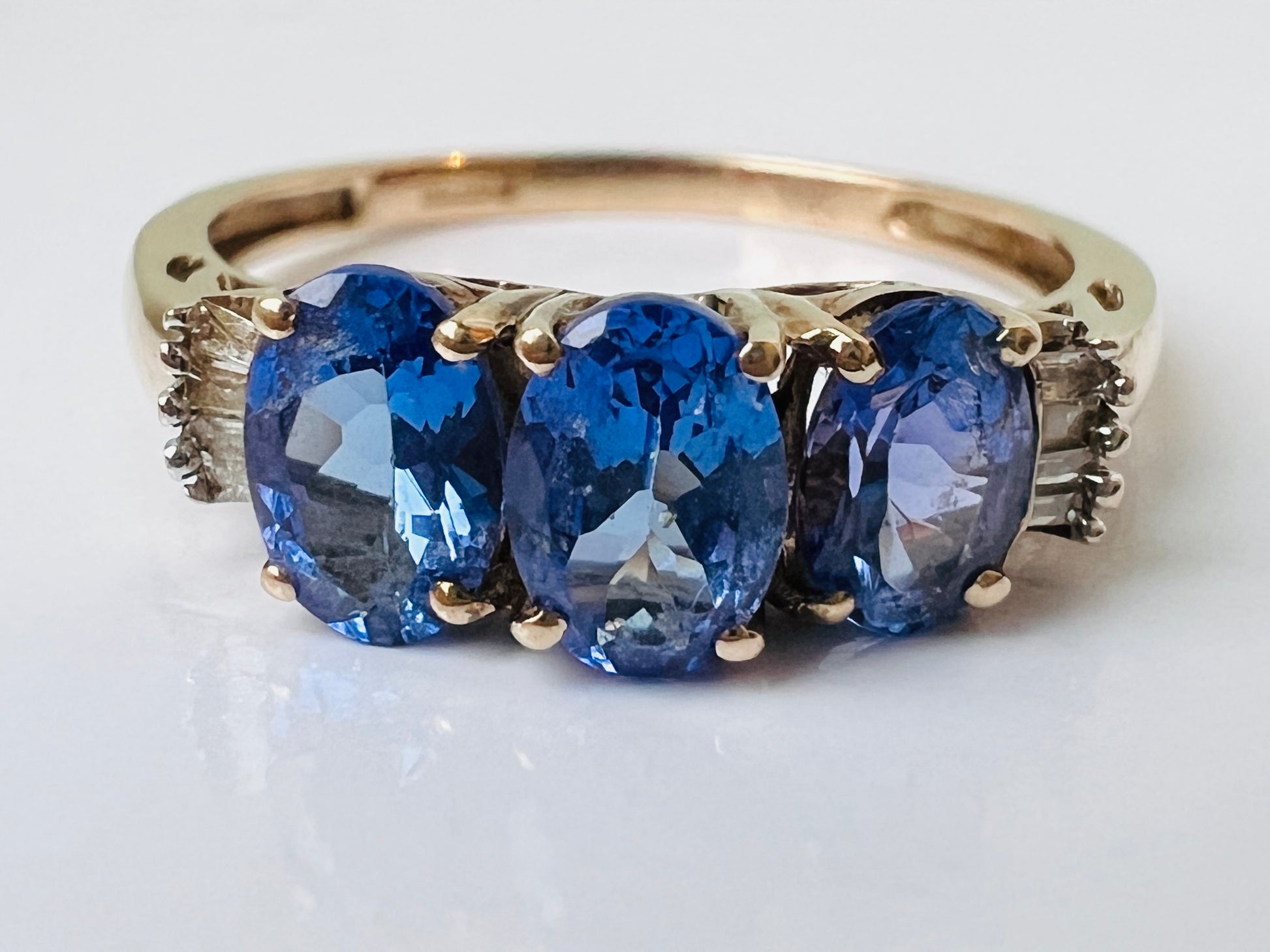 The ring features three 6 x 4mm oval tanzanite with four baguette-cut diamonds to each shoulder of the ring.