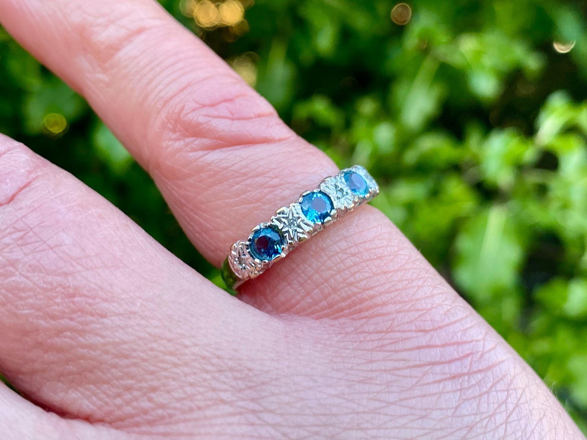 The front of the ring measures 4mm wide and features three round-cut topaz and four very small round diamonds. The stones are set into white gold with the band of the ring in yellow gold.