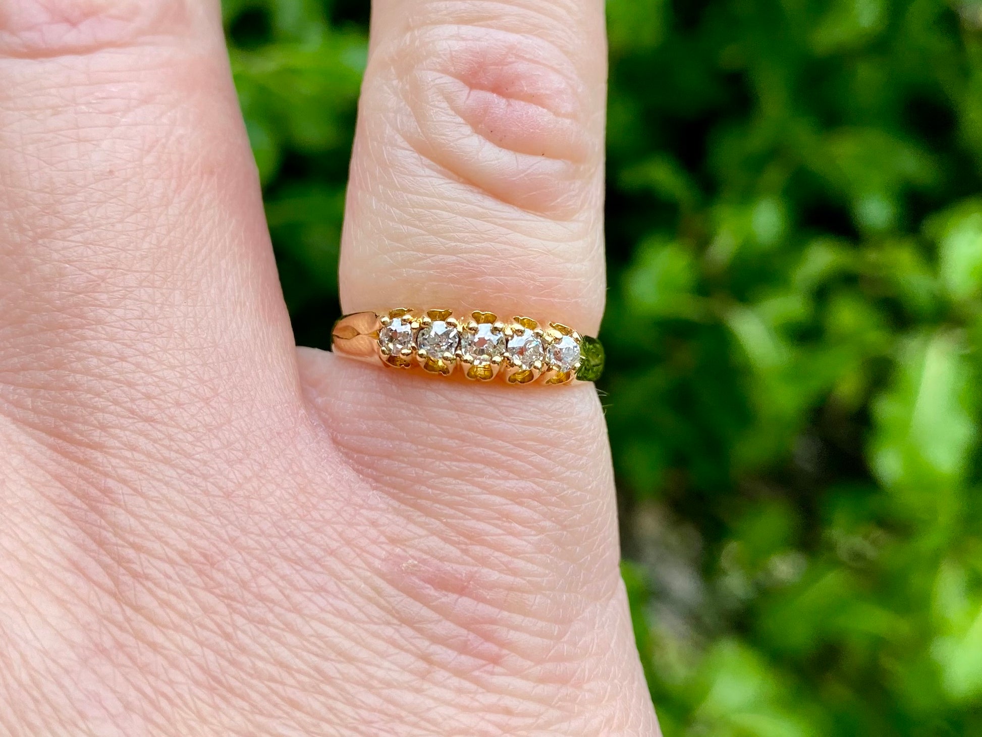The front of the ring measures 4.5mm wide and features five old round-cut diamonds. Estimated total diamond wight of 0.30cts.