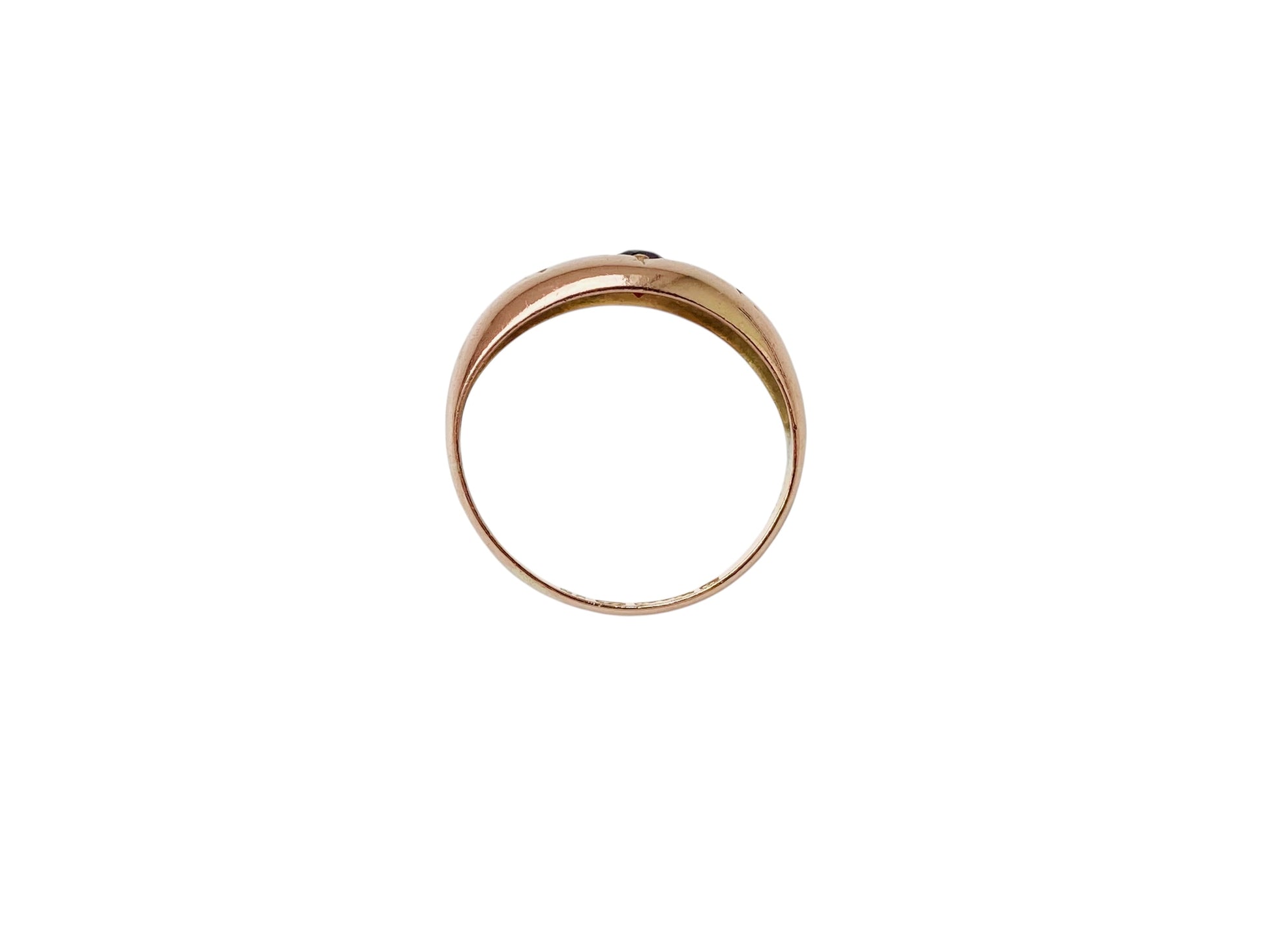 The front of the ring measures 8mm wide and features a round garnet, and two small rose-cut diamonds.