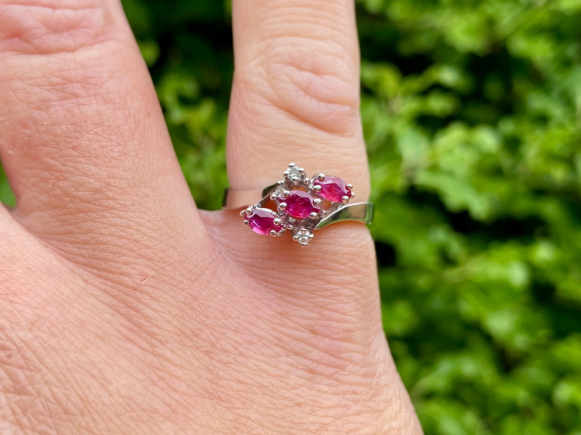 The face of the ring measures 12 x 9mm and features three marquise-cut rubies and two small round cut diamonds.