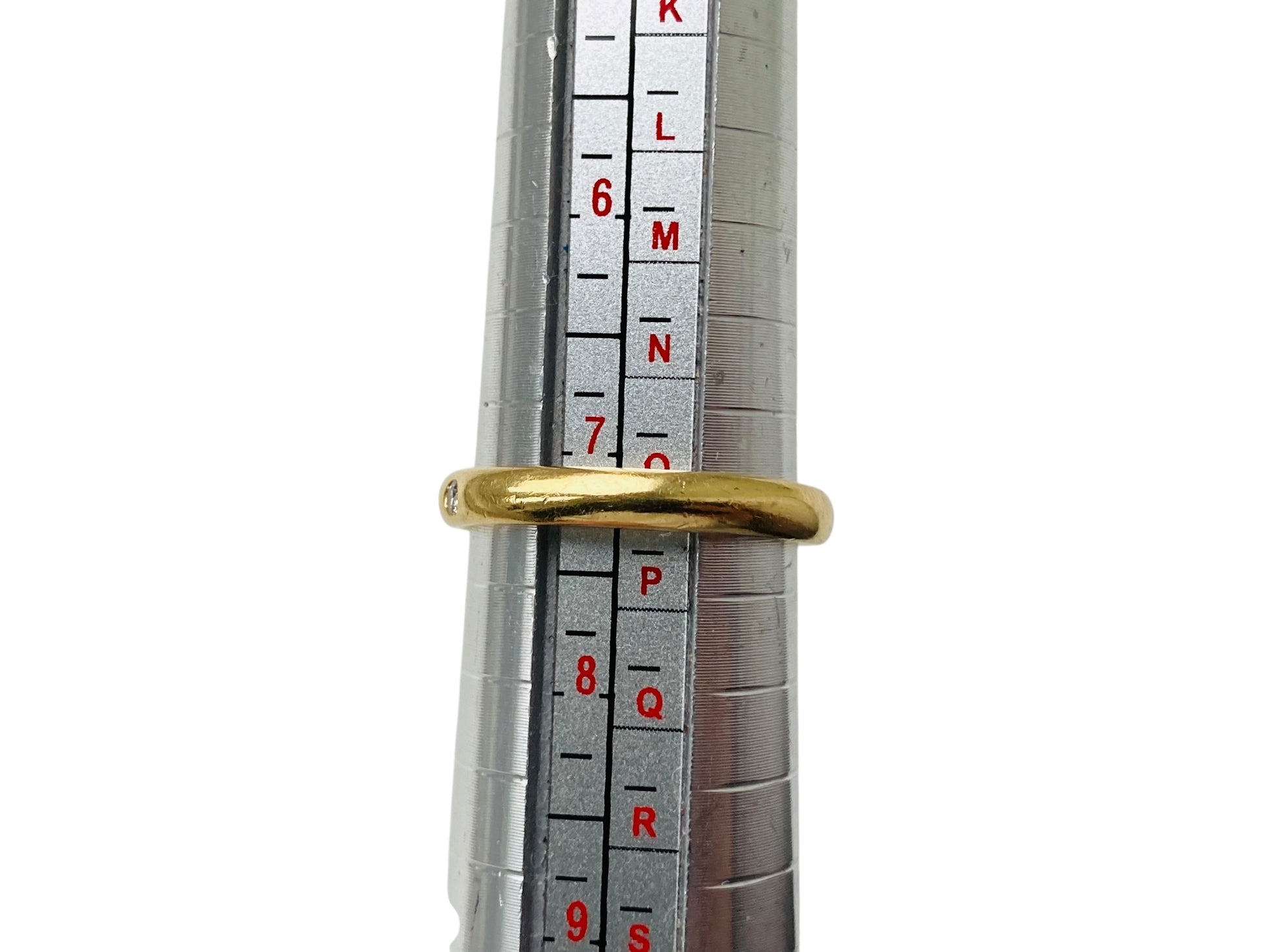 The band measures 3mm wide and features five round cut diamonds. The diamonds are set approximately one third around the band, the other two thirds of the band has no stones set.