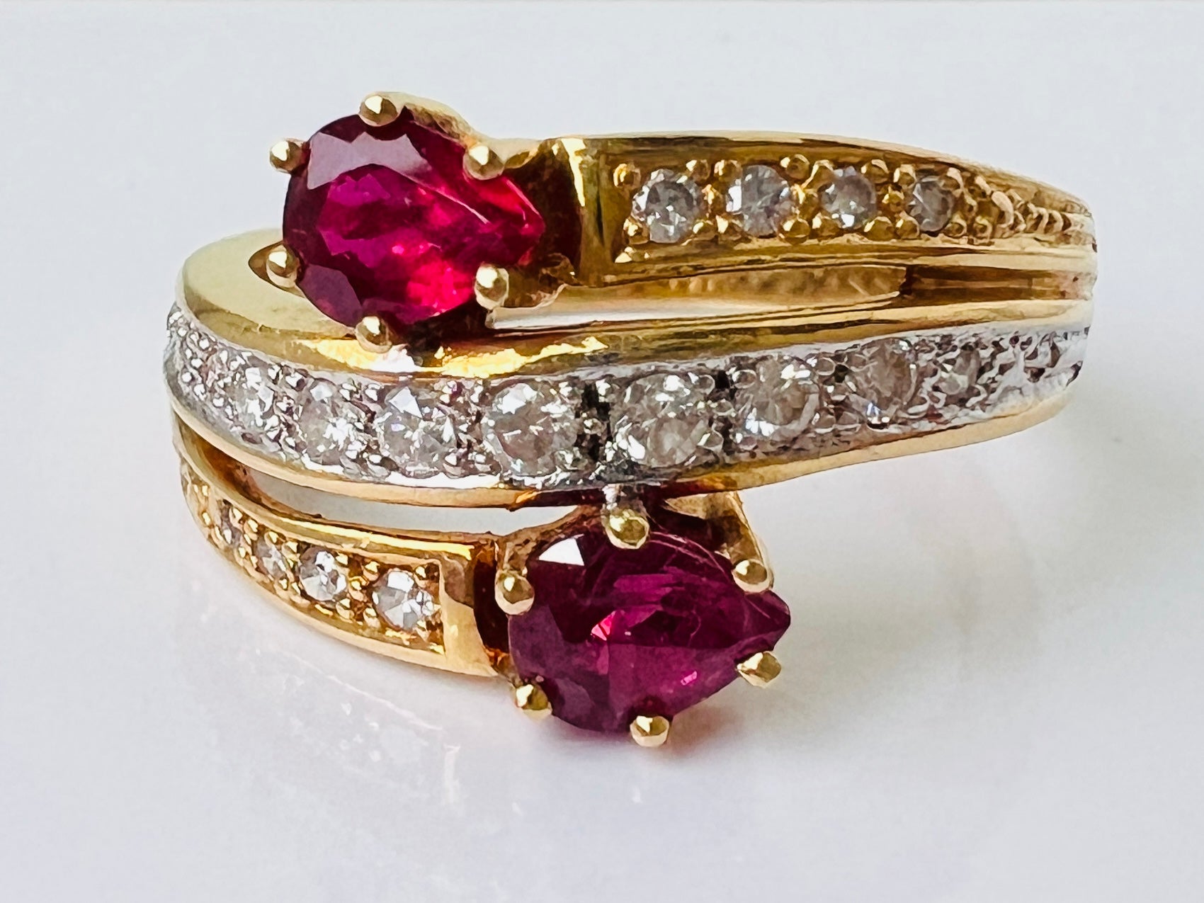 The front of the ring measures 12mm wide and features two 5 x 4mm pear-cut rubies and seventeen graduated round cut diamonds set into yellow and white18ct gold. Total diamond weight of 0.25cts.