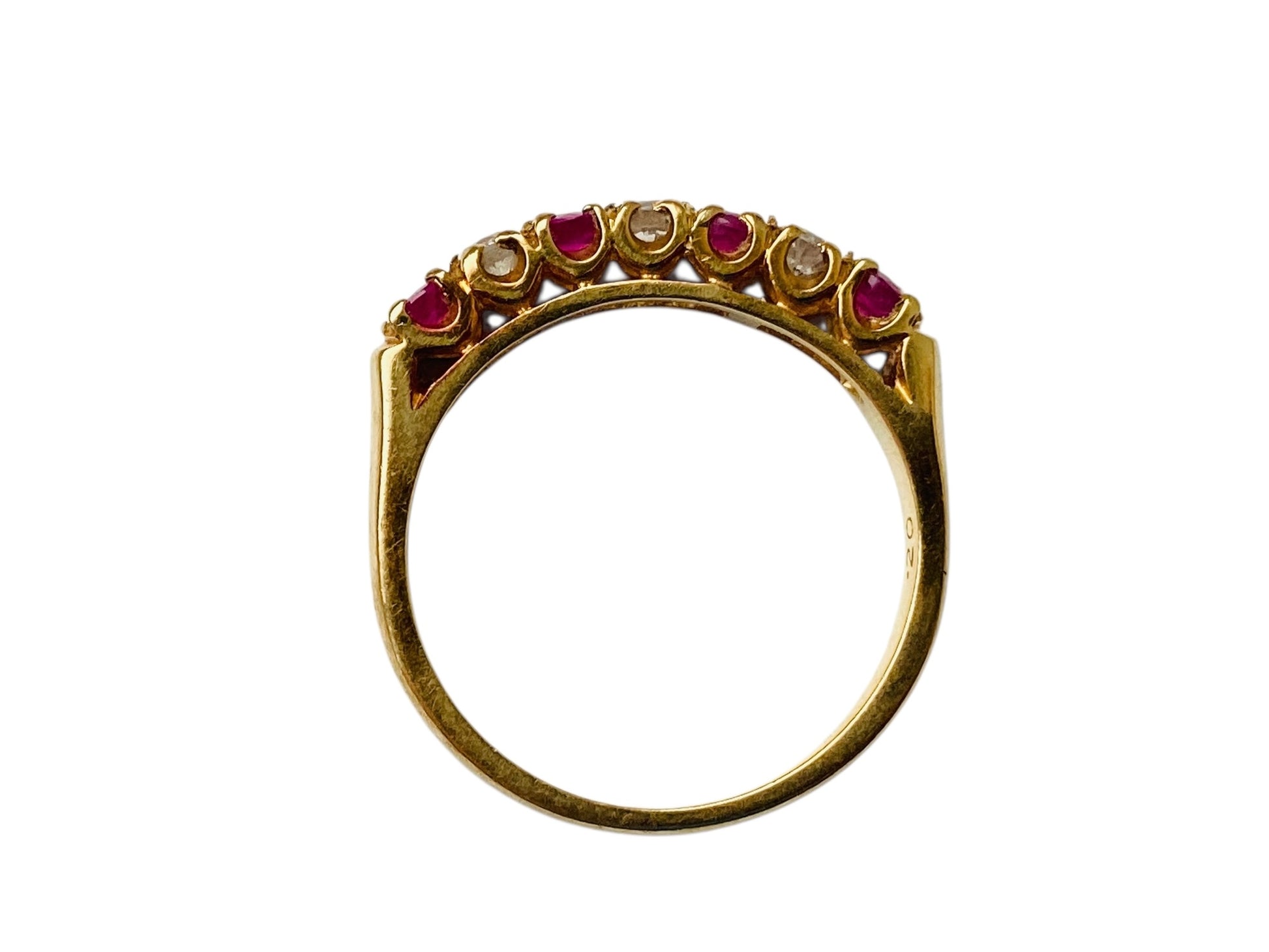 The ring at the front measures 3mm wide and features four round rubies and three round-cut diamonds.