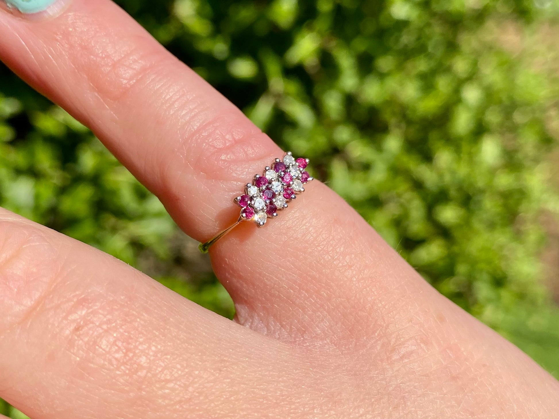 The face of the ring measures 11 x 5mm and fetaures ten small round rubies, and nine small round diamonds.