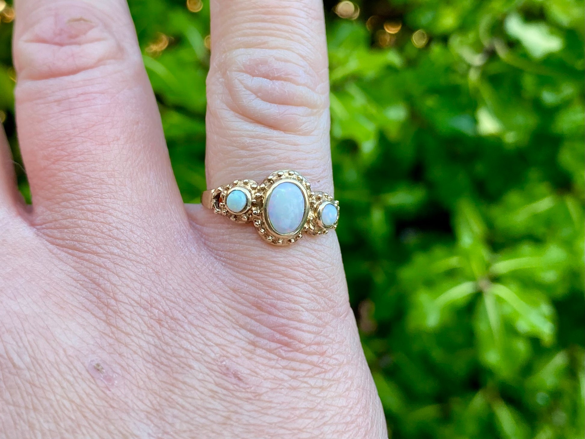 The front of the ring measures 10mm wide and features a 7 x 5mm oval opal and two round opals.