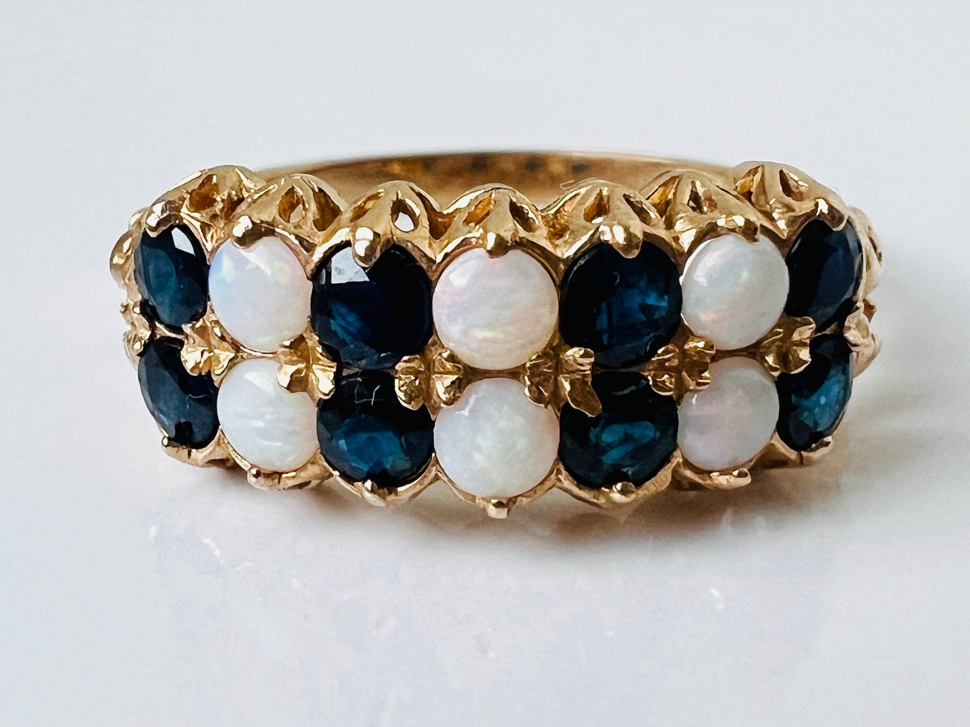 The face of the ring measures 17 x 7mm and features eight round dark sapphires and six round opals.