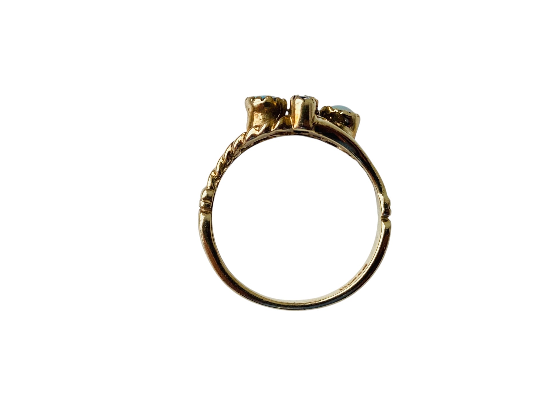 The front of the ring measures 9mm wide and features two round opals and three round sapphires.