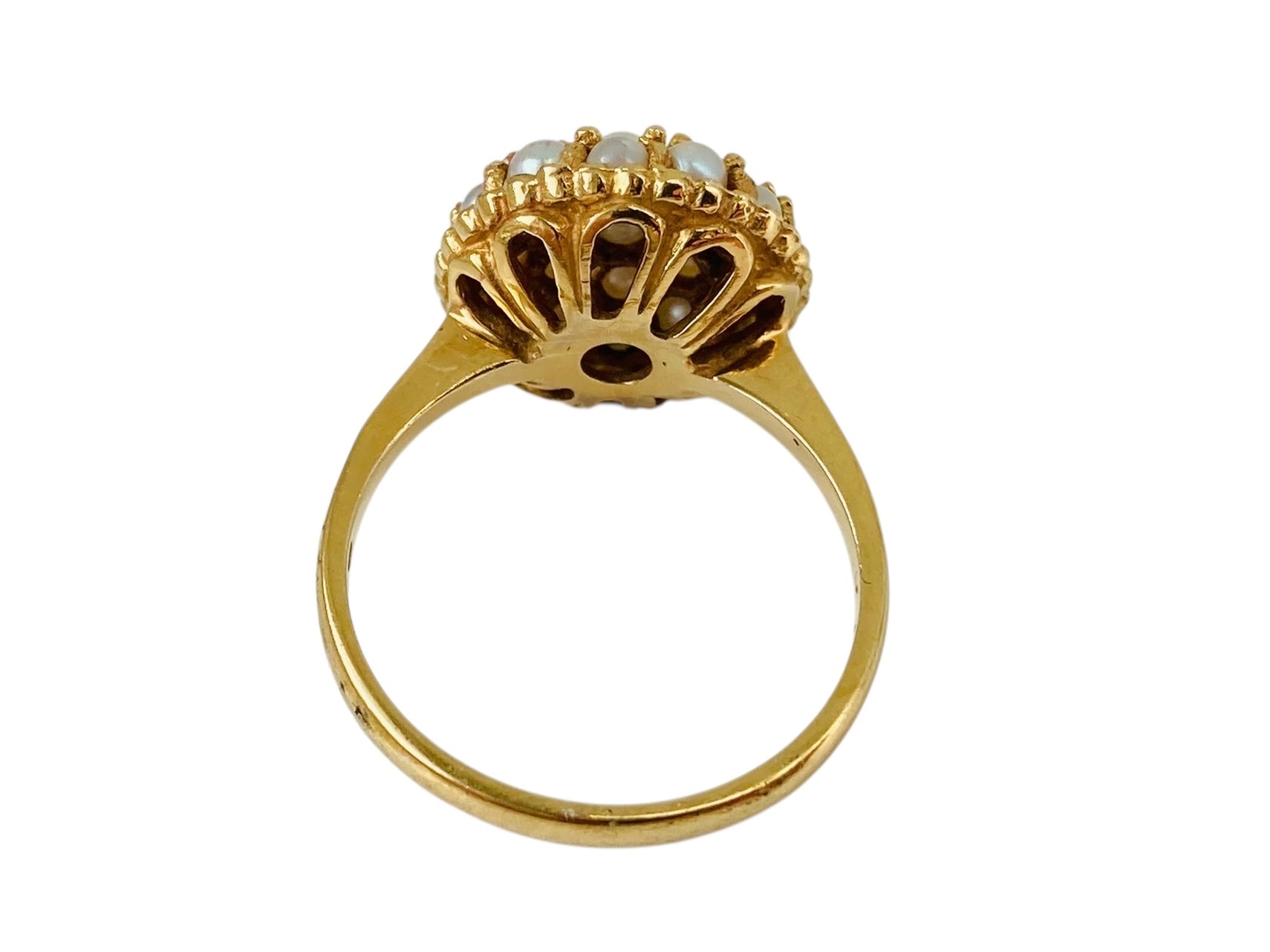 The face of the ring measures 12mm wide and features nineteen cultured pearls.
